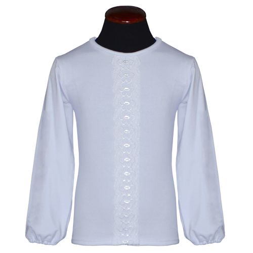 Блуза для девочки, с длинным рукавом, по переду украшена кружевом, выполнена из нежного эластичного трикотажного полотна.
