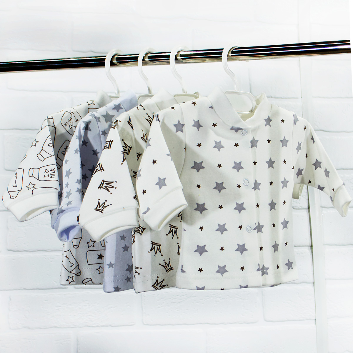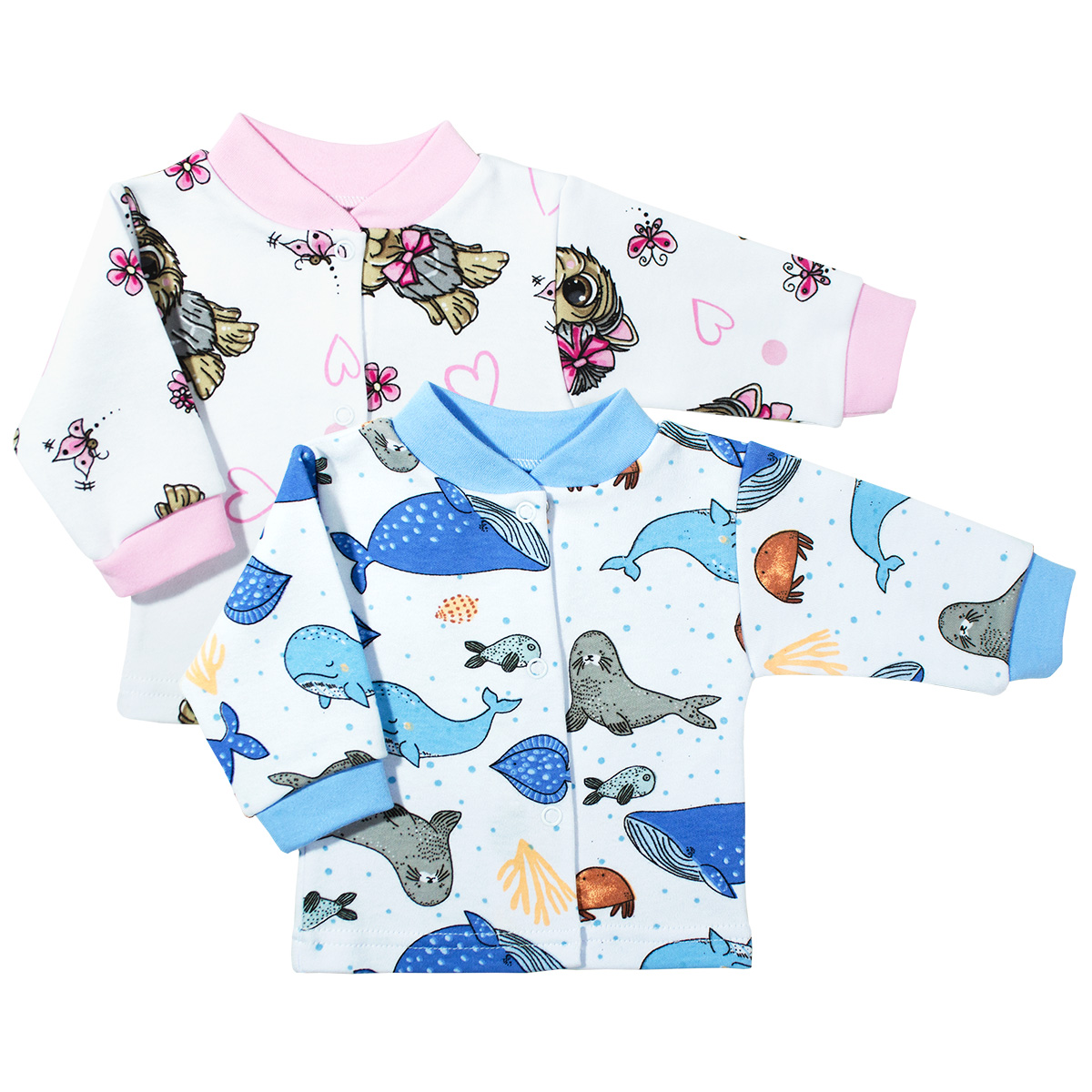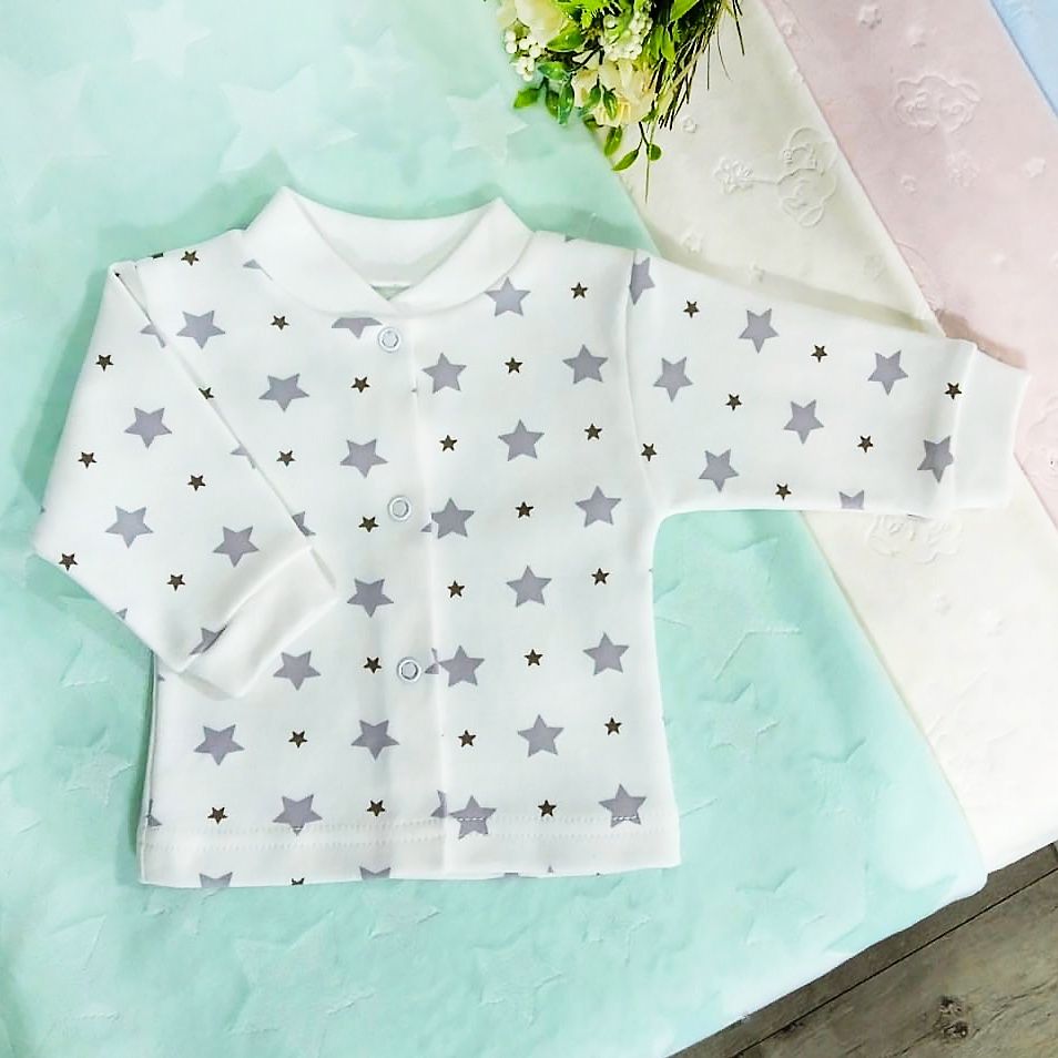 Кофточка с длинным рукавом на кнопках, выполнена из нежного трикотажного полотна. Расцветки в ассортименте. Упакована по 1 ед. в индивидуальный пакет.