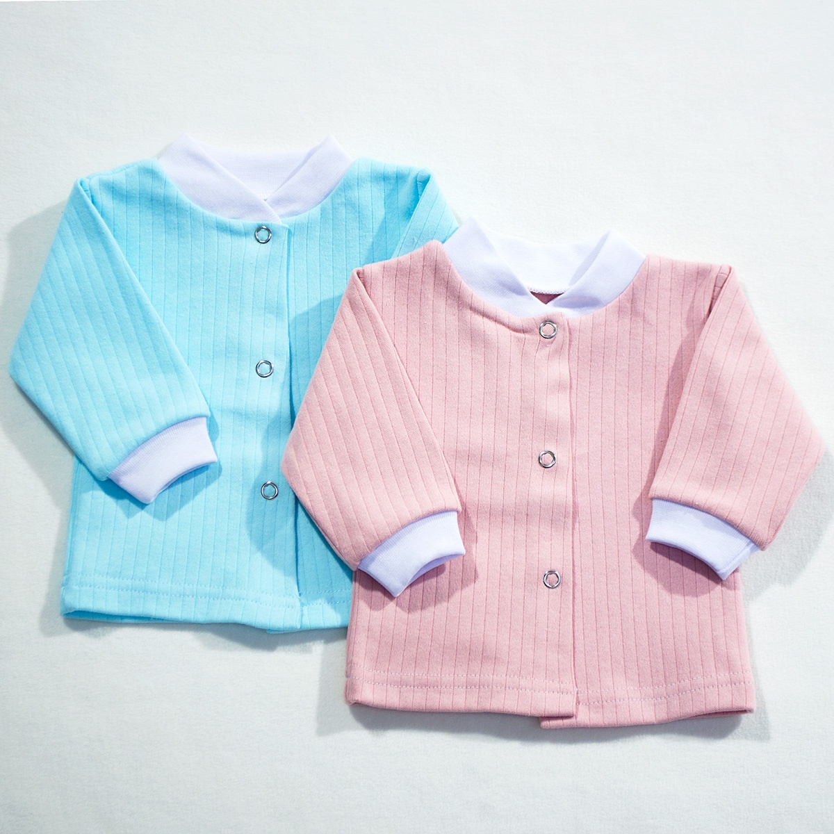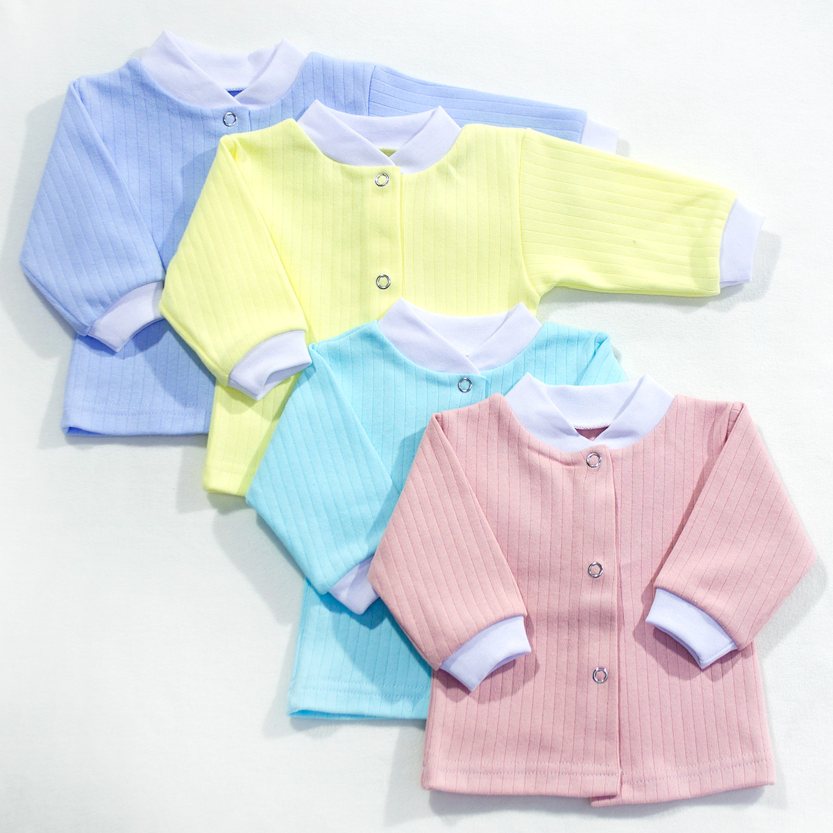Кофточка с длинным рукавом на кнопках, выполнена из трикотажного полотна средней плотности. Расцветки в ассортименте. Упакована по 1 ед. в индивидуальный пакет.