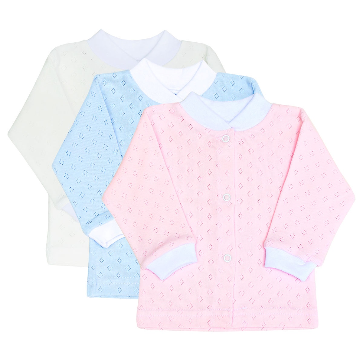 Кофточка с длинным рукавом на кнопках, выполнена из легкого ажурного полотна. Расцветки в ассортименте. Упакована по 1 ед. в индивидуальный пакет.