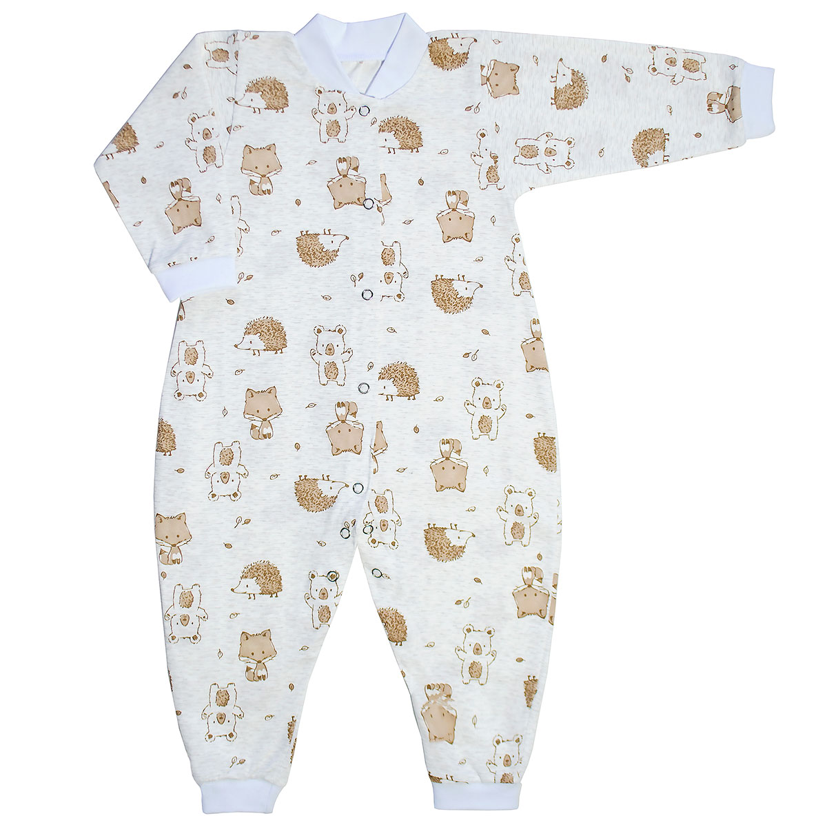 Комбинезон на кнопках, воротник стойка, с длинным рукавом на манжетах, с открытыми ножками на манжетах, полностью распашной, выполнен из легкого трикотажного полотна. Цветовая гамма разнообразна. Упакован в индивидуальный пакет по 1 ед.