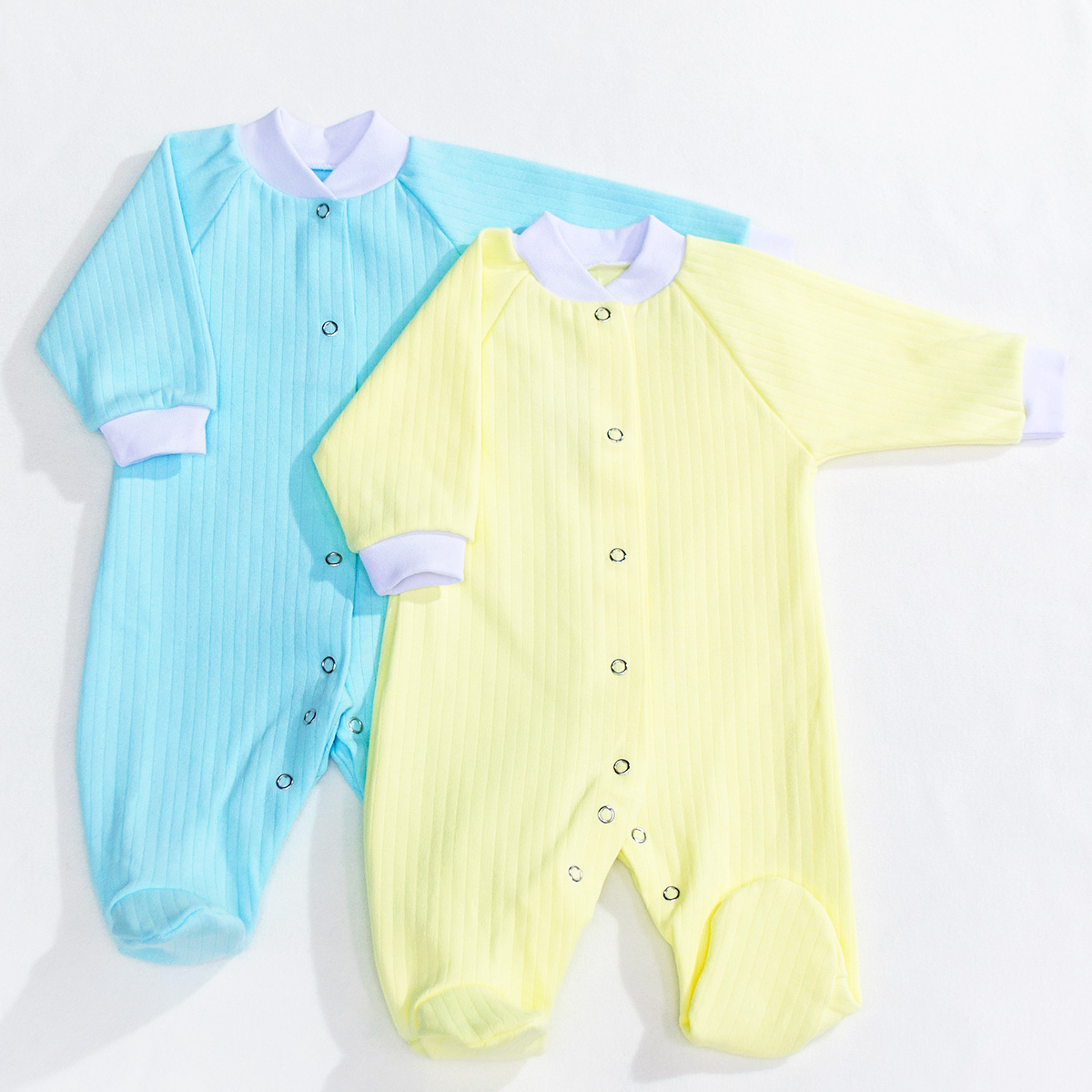 Комбинезон на кнопках, полностью распашной до следика, с ластовицей, со следиком, воротник стойкой, выполнен из трикотажного полотна средней плотности. Упакован по 1 ед. в индивидуальный пакет.