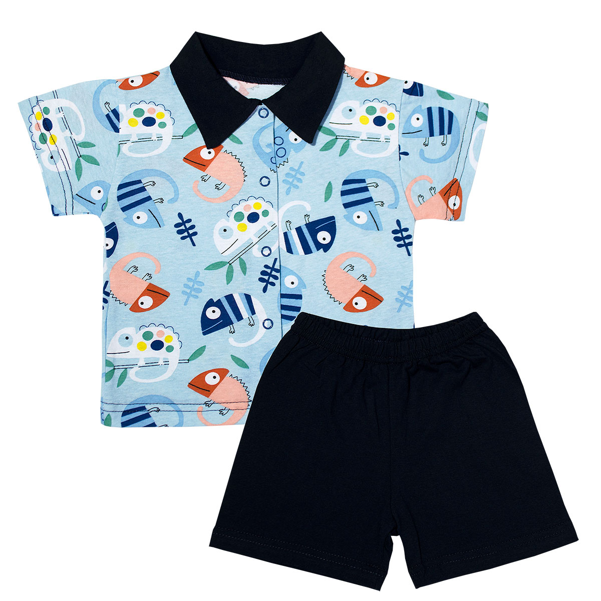 Комплект одежды из двух предметов, для мальчика, выполнен из легкого трикотажного полотна. В комплект входит: -рубашка, -шорты. Цвета в ассортименте. Комплект упакован в пакет.