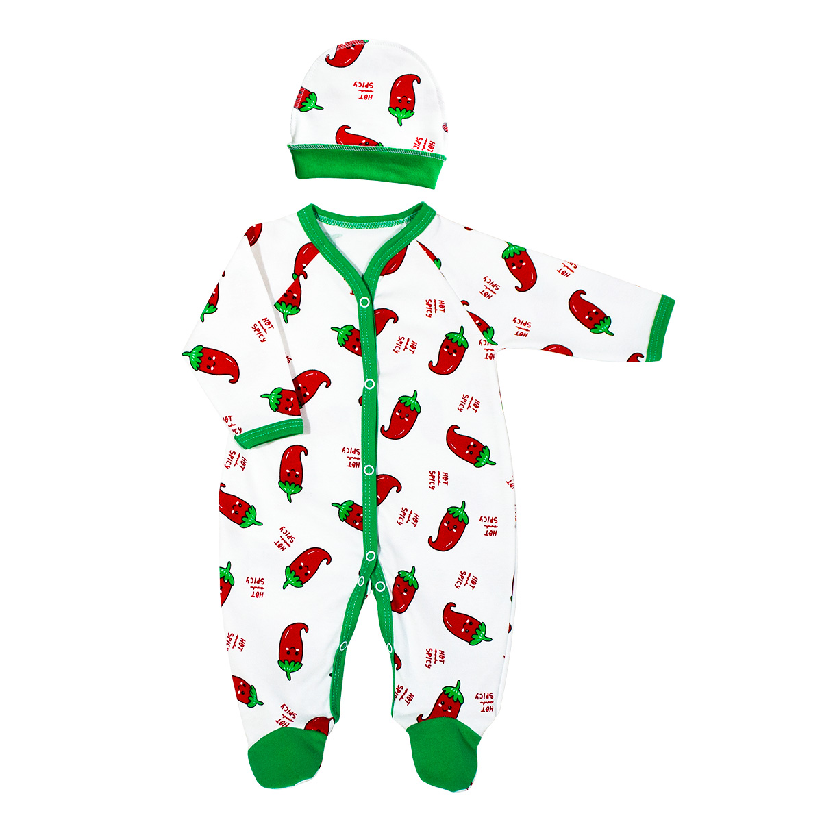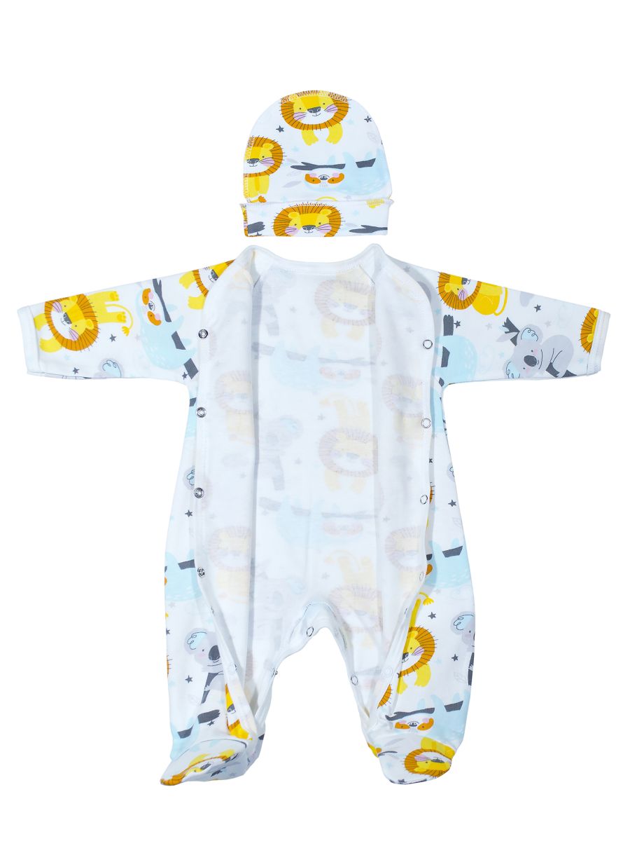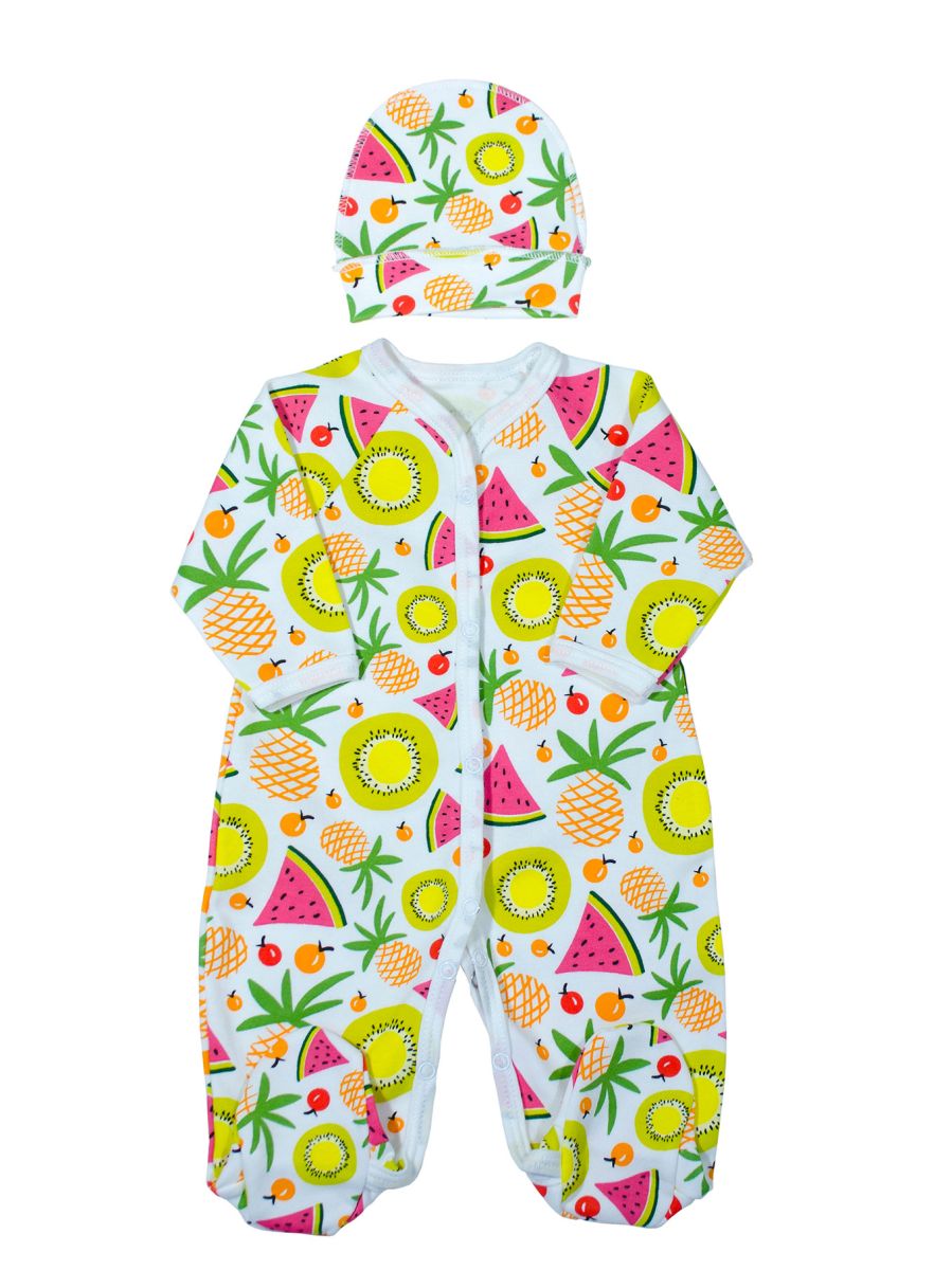 Комплект одежды для новорожденного, полностью распашной комбинезон с длинным рукавом и шапочка на рибане, выполнен из нежного трикотажного полотна средней плотности. Материал: - Интерлок пенье 100% хлопок Цвет в ассортименте. Упаковано в индивидуальный пакет.