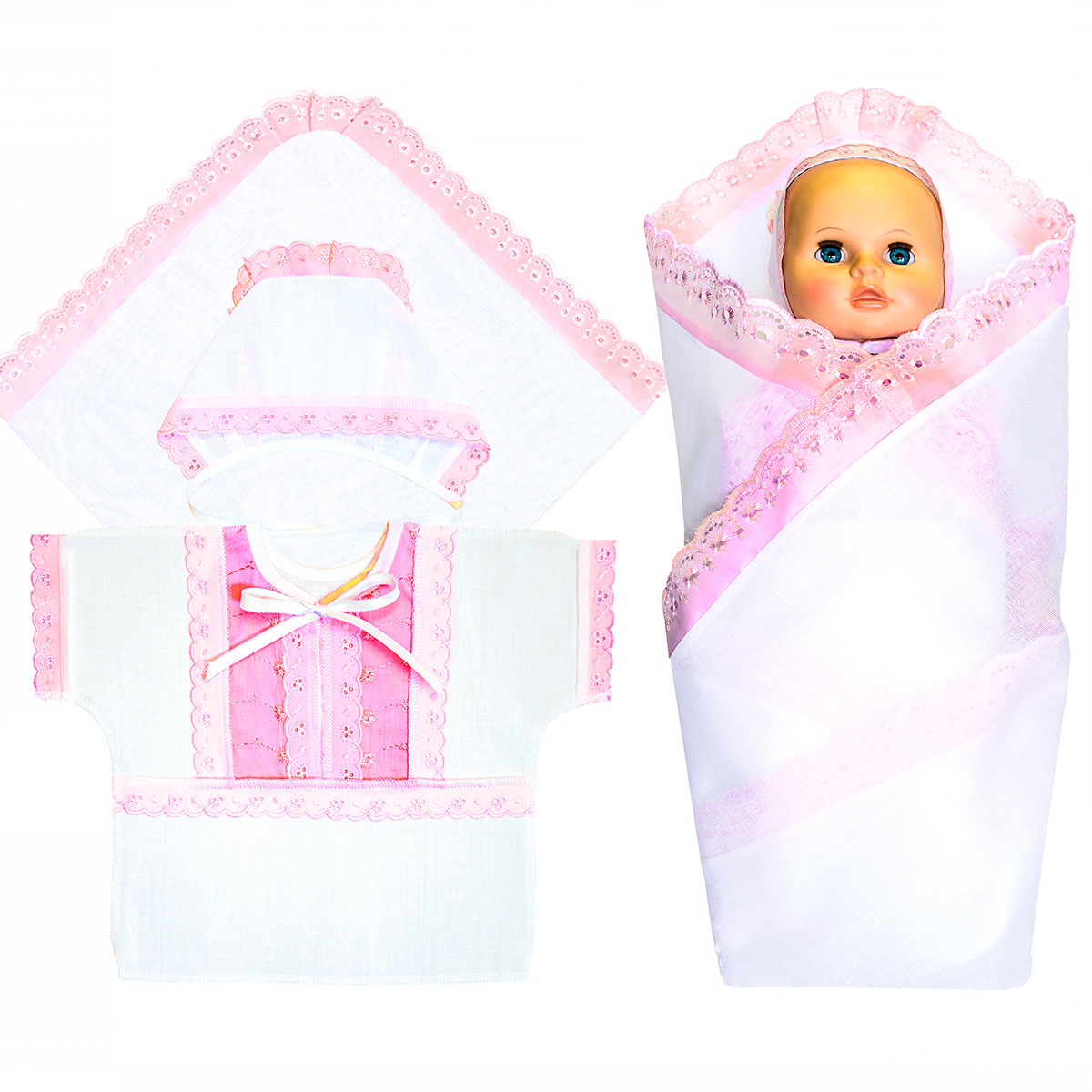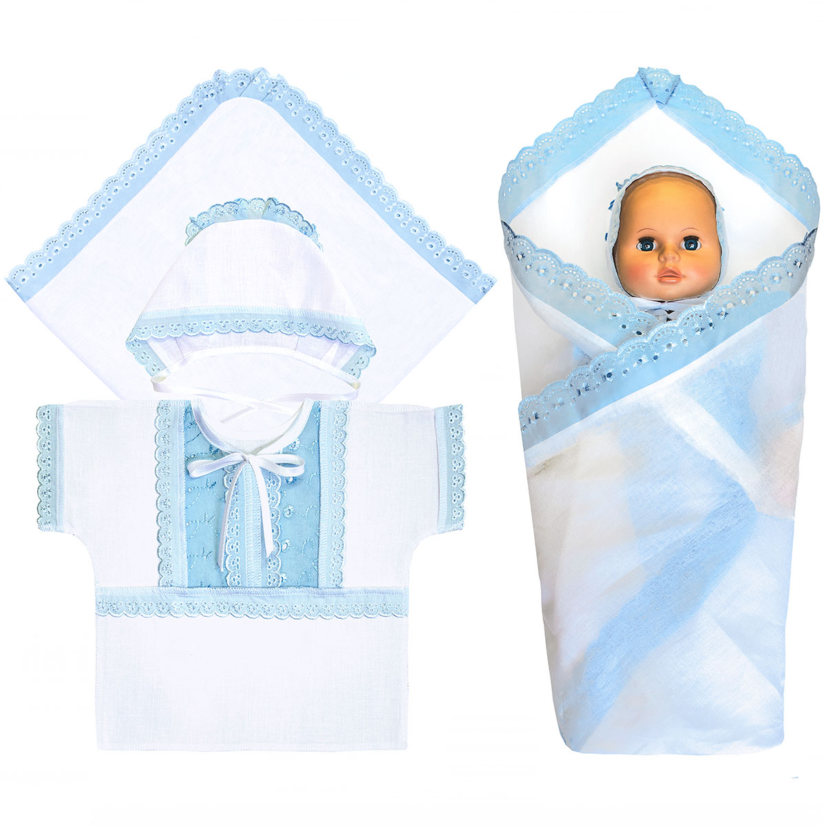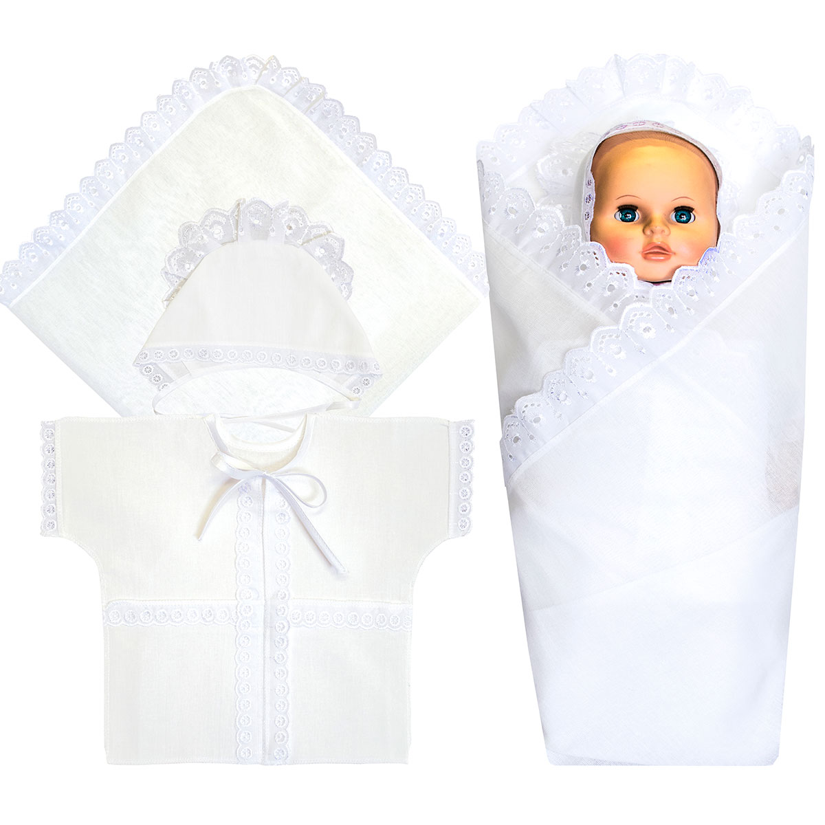 Комплект предназначен для проведения обряда крещения, выполнен из бязи гладкокрашеной, с отделкой кружевом. В комплект входит 3 предмета: - рубашечка, - чепчик, - простынка. Комплект упакован в прозрачный пакет.