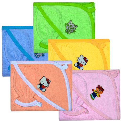 Комплект для купания /полотенце-уголок размером 80*100см, варежка/, на уголке нанесена термоаппликация, выполнен из 2-х сторонней махры. Упаковано по 1 ед. в п/п пакет. Термоаппликация может отличаться от фотографии.