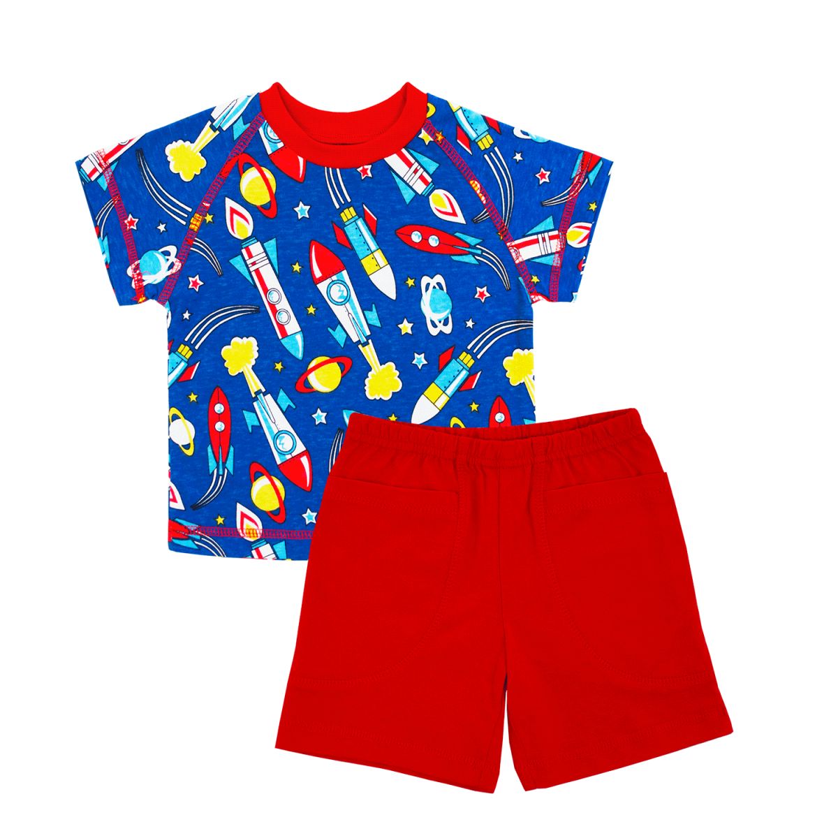 Комплект 2-х предметный для мальчика, выполнен из легкого хлопкового трикотажного полотна. В комплект входит: -футболка -шорты с накладными карманами Упакован в индивидуальный пакет.