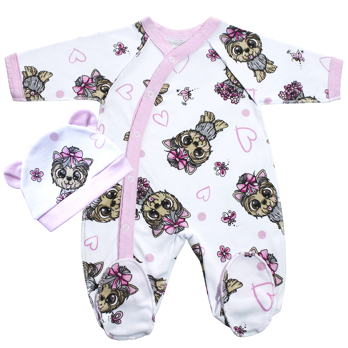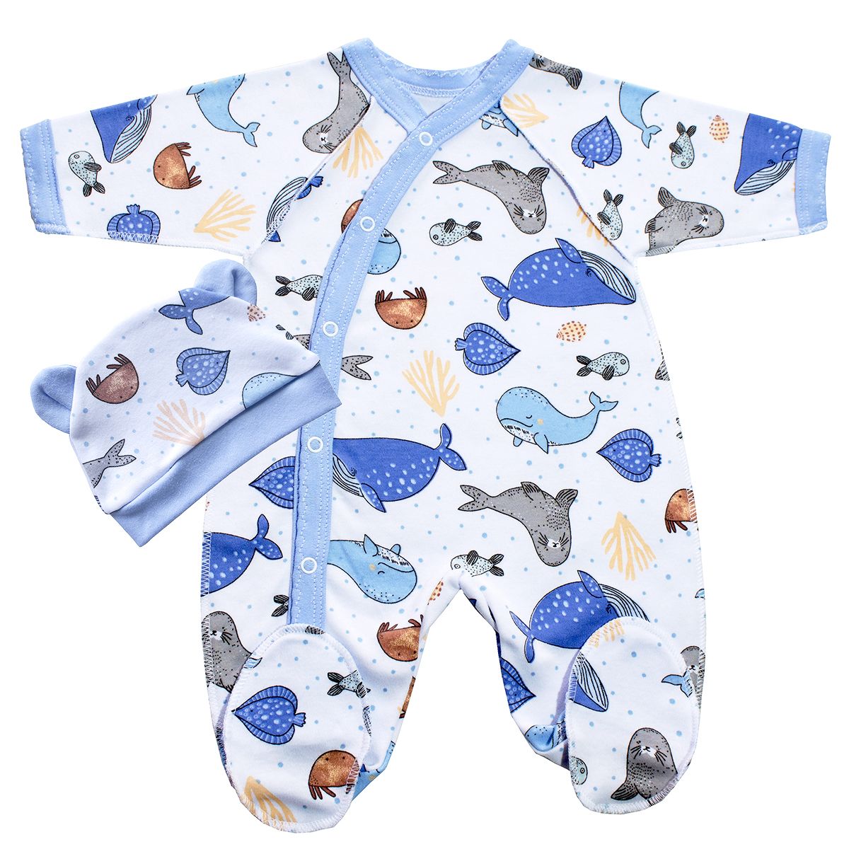 Комбинезон: - На кнопках - Открытый рукав - Следик - Распашной (асимметрия) Шапочка с ушками Материал: - Интерлок-пенье 100% х/б Упакованы по 1 ед. в индивидуальный пакет. Расцветки в ассортименте.