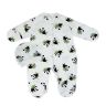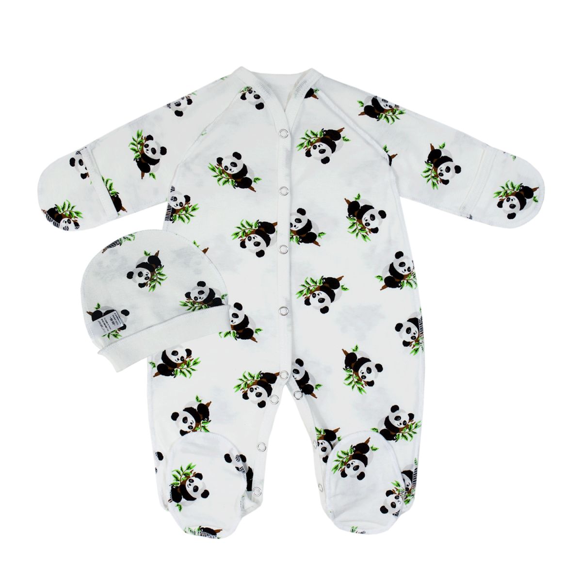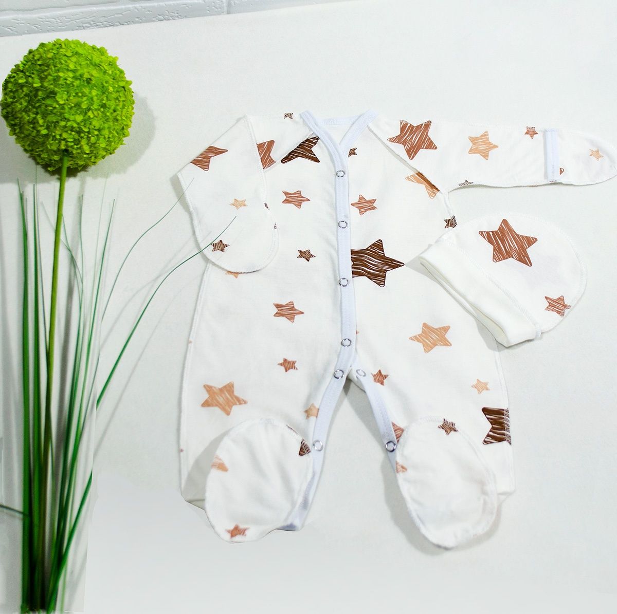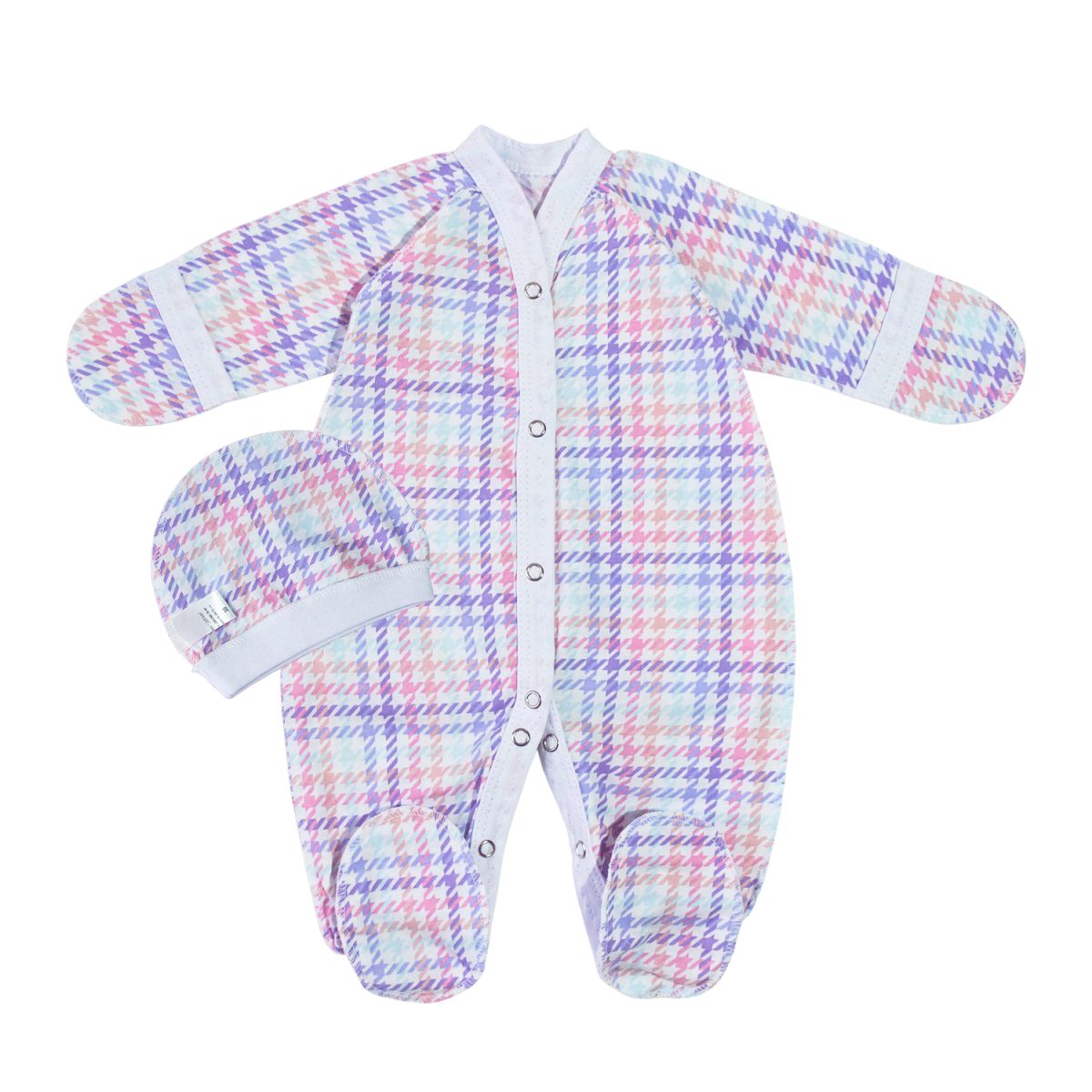 Комплект нательной одежды из кулирного полотна для новорожденного малыша от 0 до 3 месяцев. - Комбинезон распашной на кнопках с длинным универсальным рукавом реглан, со следиком и ластовицей, - Шапочка Швы наружу Материал: - Кулирное полотно, хлопок 100% Расцветки в ассортименте Упаковано в прозрачный пакет.