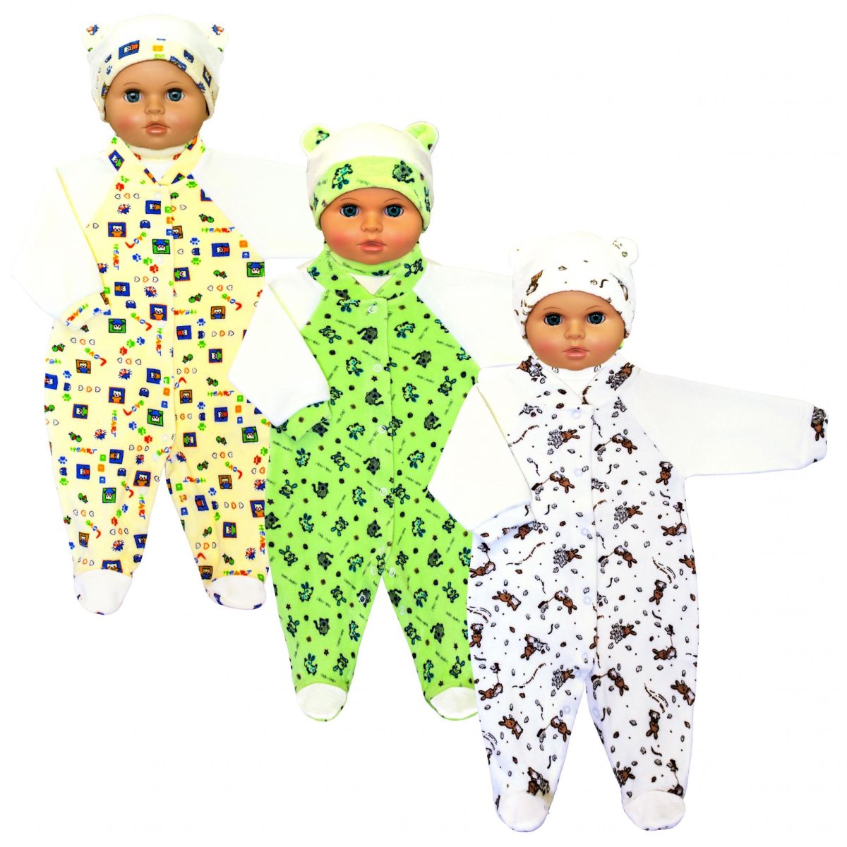 Комплект состоящий из комбинезона и шапочки, выполнен из велюрового трикотажного полотна. Комбинезон комбинированный на кнопках, с длинным рукавом, распашной до следика, с ластовицей, воротник стойкой. Шапочка комбинированная. Комплект упакован по 1 ед в индивидуальный пакет.