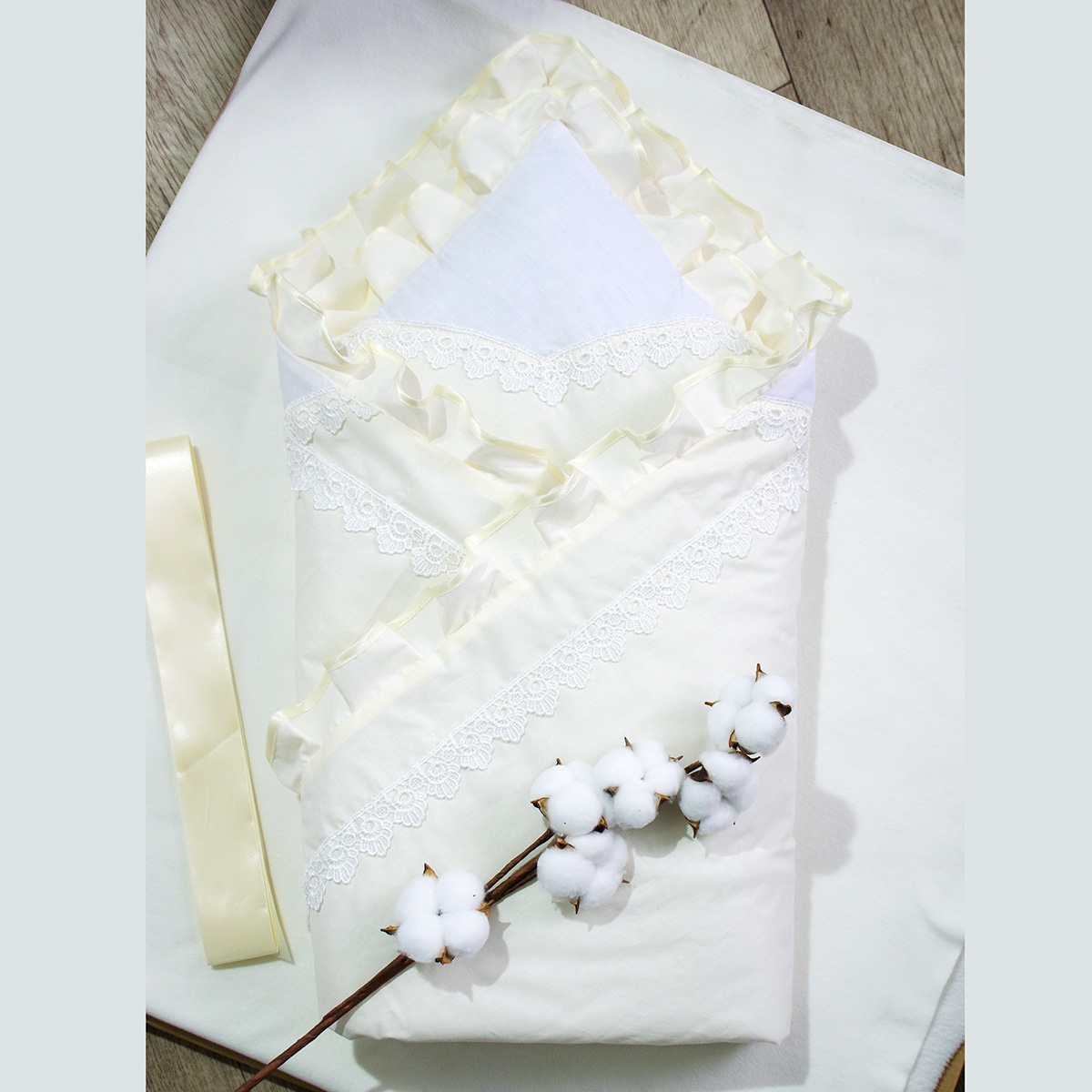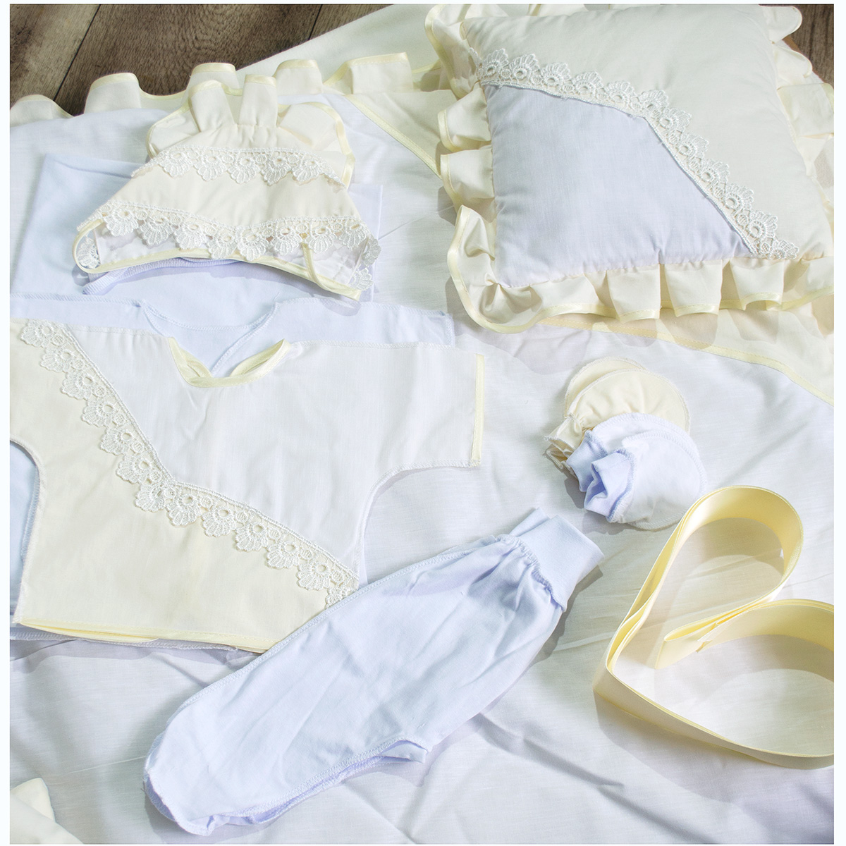 Комплект на выписку для новорожденного, выпускается на разные сезоны, наполнитель комплектуется в зависимости от сезона, а именно: Летний комплект, предназначен для использования при температурах воздуха от +20С до +10С, с наполнителем 100г/м² Демисезонный комплект, предназначен для использования, при температурах воздуха от +10С до -10С, с наполнителем 200г/м² Зимний комплект, предназначен для использования, при температурах воздуха от -10С до -25С, с наполнителем 400г/м² В состав комплекта входит 11 предметов: - одеяло нарядное, размер 100х100см, основная ткань поплин гладкокрашеный (наполнитель холлофайбер "Аляска", плотностью по сезону); - подушка нарядная, размер 25*25см основная ткань поплин гладкокрашеный (наполнитель холлофайбер "Аляска" 800 г/кв.м);; - чепчик нарядный, размер 36, основная ткань поплин гладкокрашеный; - чепчик, размер 36, из трикотажного кулирного полотна; - распашонка нарядная, размер 56-36, основная ткань поплин гладкокрашеный; - распашонка, размер 56-36, из трикотажного кулирного полотна; - ползунки, размер 56-36, из трикотажного кулирного полотна; - рукавички, основная ткань поплин гладкокрашеный; - рукавички, из трикотажного кулирного полотна; - пеленка, размер 110х80, из трикотажного кулирного полотна; - лента атласная ширина 5 см, длина 300 см, позволит сделать красивый бант. ПРИМЕЧАНИЕ: Основная ткань поплин гладкокрашеный, без рисунка.