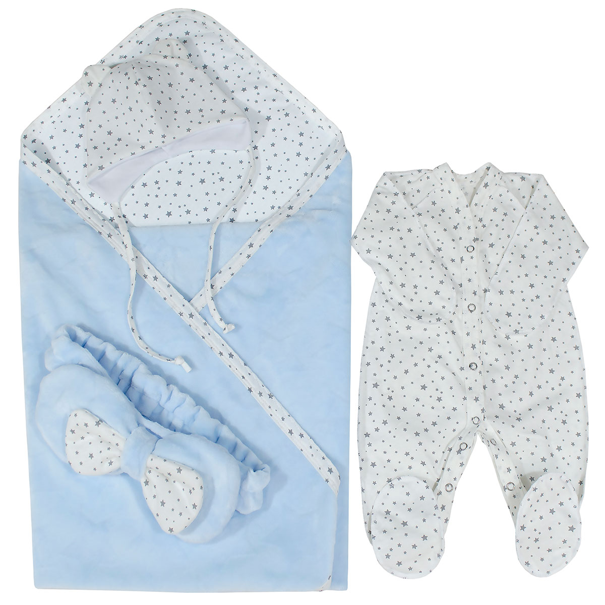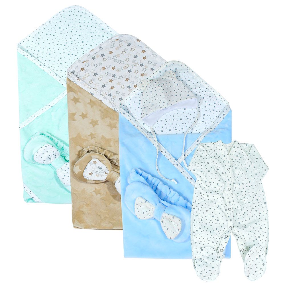 Комплект на выписку 4-х предметный. - Одеяло (плюш, кулирное полотно) 90*90 - Бант на резинке с поясом на липе - Чепчик, 38р., кулирное полотно 100% х/б - Комбинезон распашной на кнопках 56-36, кулирное полотно 100% х/б Цвет в ассортименте. Упаковано по 1 ед. в индивидуальный пакет.