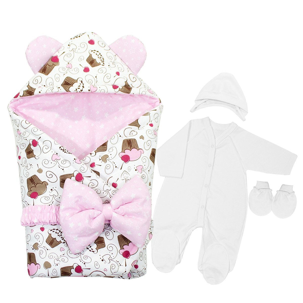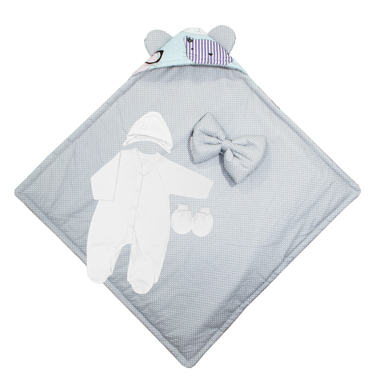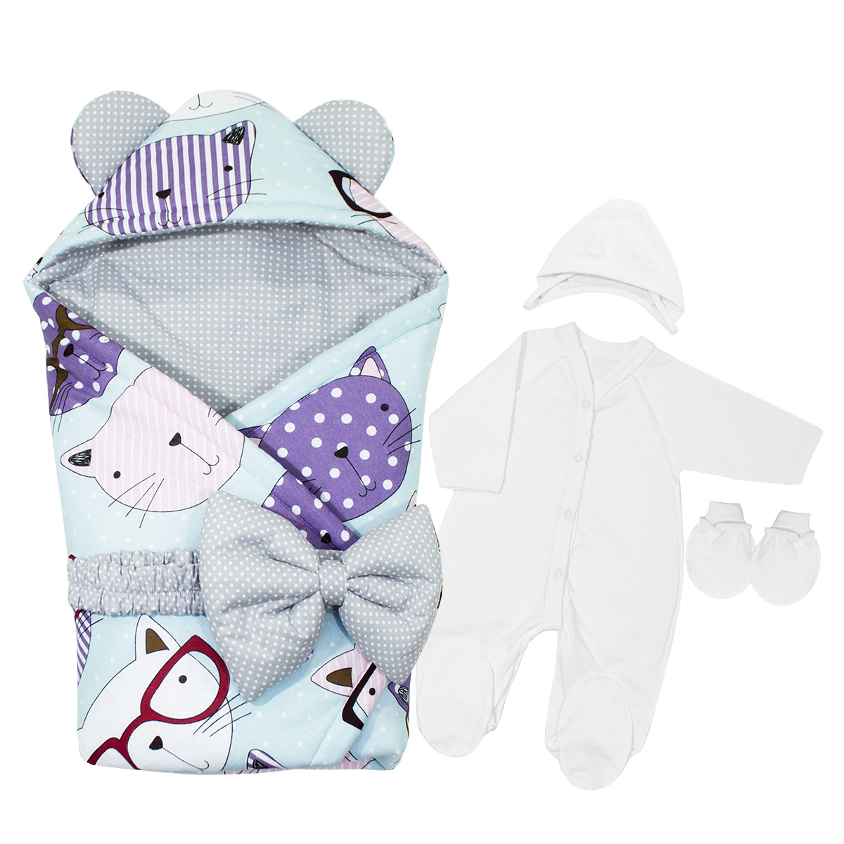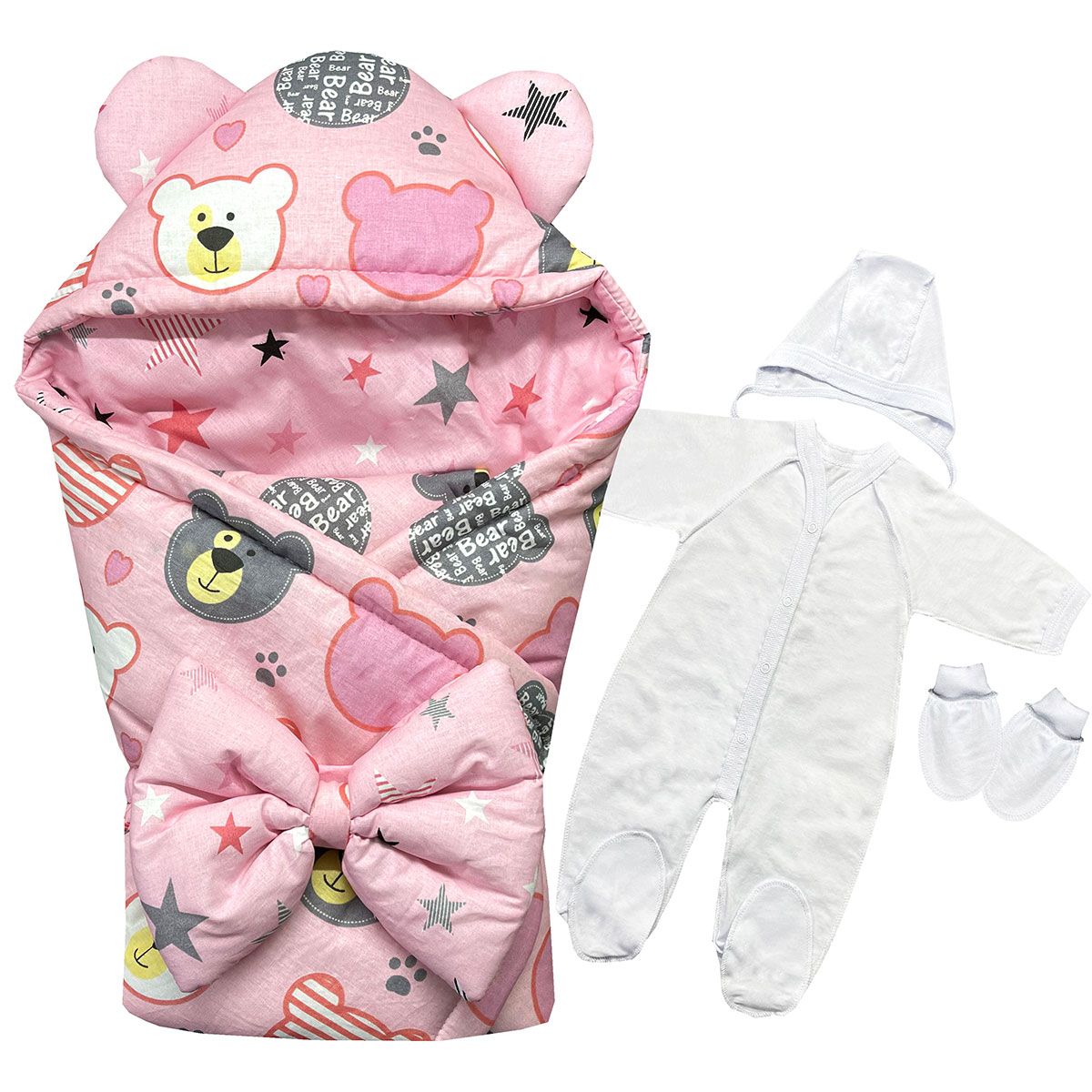 Комплект на выписку для новорожденного, состоит из пяти предметов: - Одеяло с уголком 90х90см, основная ткань бязь набивная, наполнитель холлофайбер "Аляска", плотностью наполнителя комплектуется в зависимости от сезона. - Пояс с бантом на липе, - Комбинезон на кнопках, рукав реглан, с ластовицей, со следиком из кулирного трикотажного полотна, р.56-36 - Чепчик из кулирного трикотажного полотна, р.36 - Рукавички на манжетах из кулирного трикотажного полотна. Демисезонный комплект, предназначен для использования, при температурах воздуха от +10С до -10С, с наполнителем 200г/м² Зимний комплект, предназначен для использования, при температурах воздуха от -10С до -25С, с наполнителем 400г/м² ПРИМЕЧАНИЕ: Основная ткань может отличаться от фото!