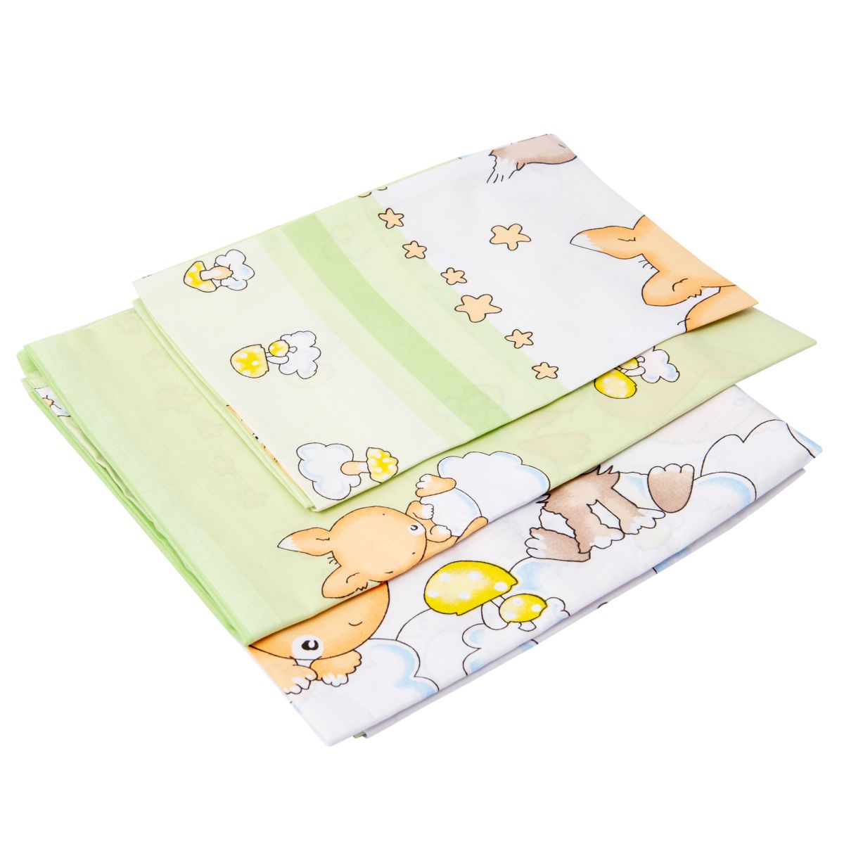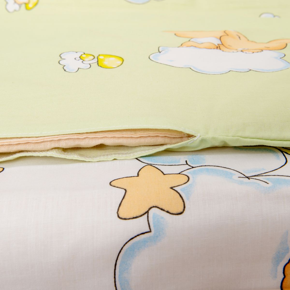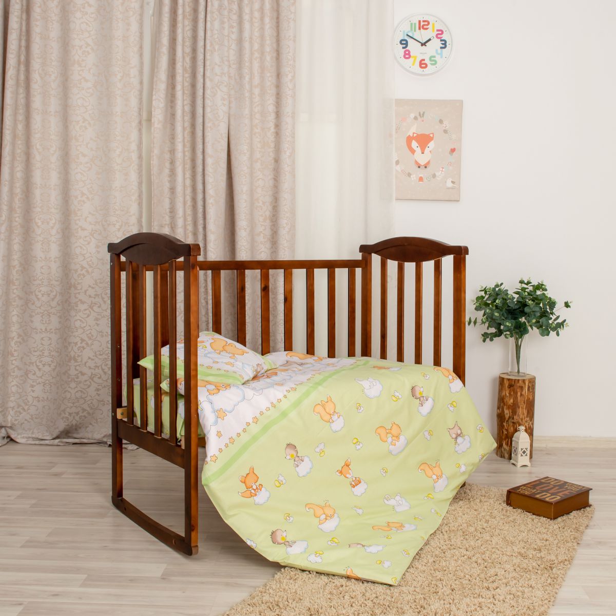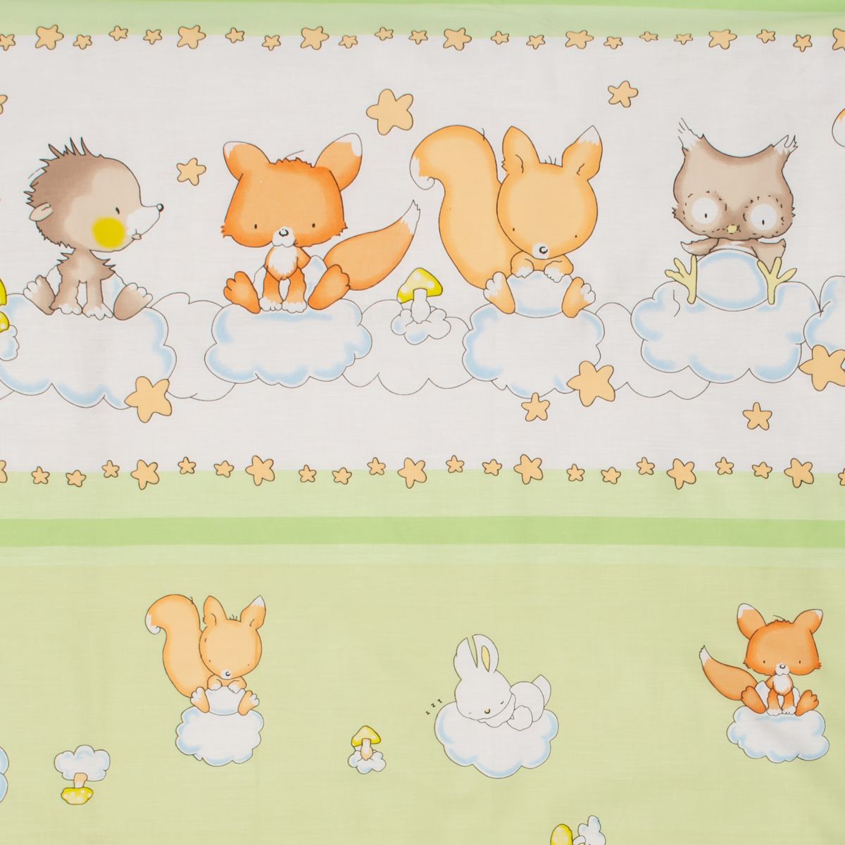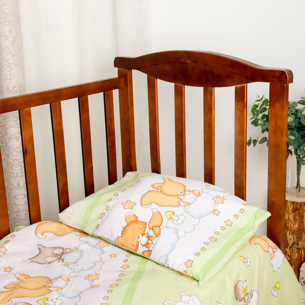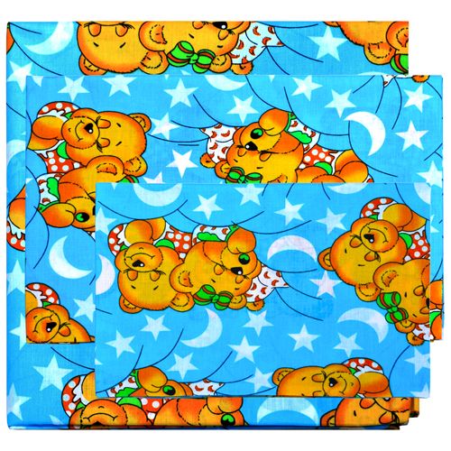 Комплект постельного белья для детской кроватки, с квадратным пододеяльником, изготовлен из поплина с набивным рисунком. В комплект входит три предмета: - пододеяльник 122*122см: - простынь 95*147см: - наволочка 42*62см. Комплект упакован в пакет. Набивной рисунок может отличаться от фото.