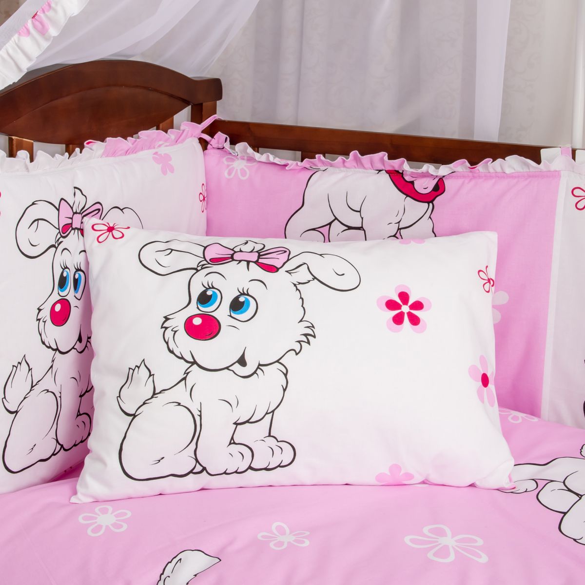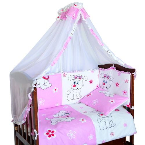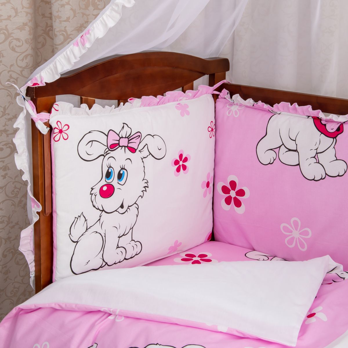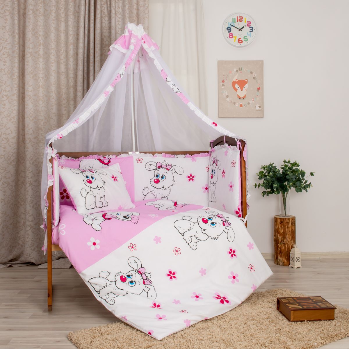 Комплект постельных принадлежностей для детской кроватки из 7-ти предметов (поплин): - бортик высокий, 4-х сторонний, изделие состоит из 4-х деталей, выполнено из поплина импортного производства с крупным рисунком, в качестве наполнителя используется синтепон. Высота изделия 50 см.; - балдахин изготовлен из вуали, изделие декорировано бязью импортного производства. Размер изделия 300*150 см. - одеяло прямоугольной формы, с наполнителем холлофайбер 400г/кв м. Размер 110*140см; - подушка прямоугольной формы, с наполнитель холлофайбер 800г/кв м. Размер 40*60см; - пододеяльник для прямоугольного одеяла, изготовлен из поплина. Размер 112*147см; - простыня прямая, изготовлена из поплина. Размер 95*147см; - наволочка для подушки прямоугольной формы, изготовлена из поплина. Размер 42*62см: Цвет в ассортименте. Комплект упакован в пакет. Примечание: Держатель для балдахина не входит в комплект. Набивной рисунок может отличаться от фото.
