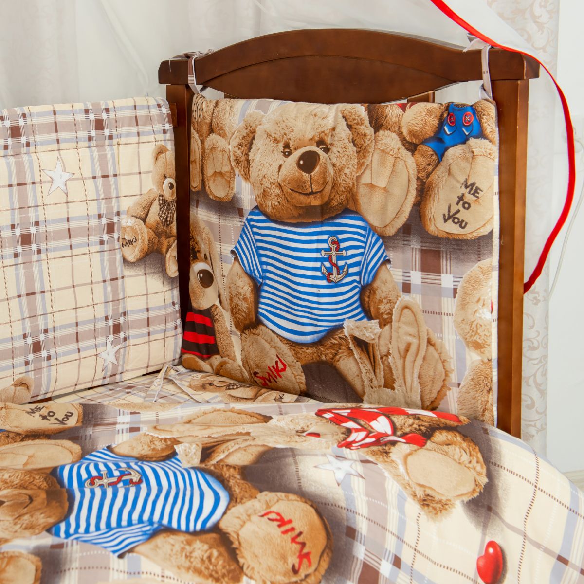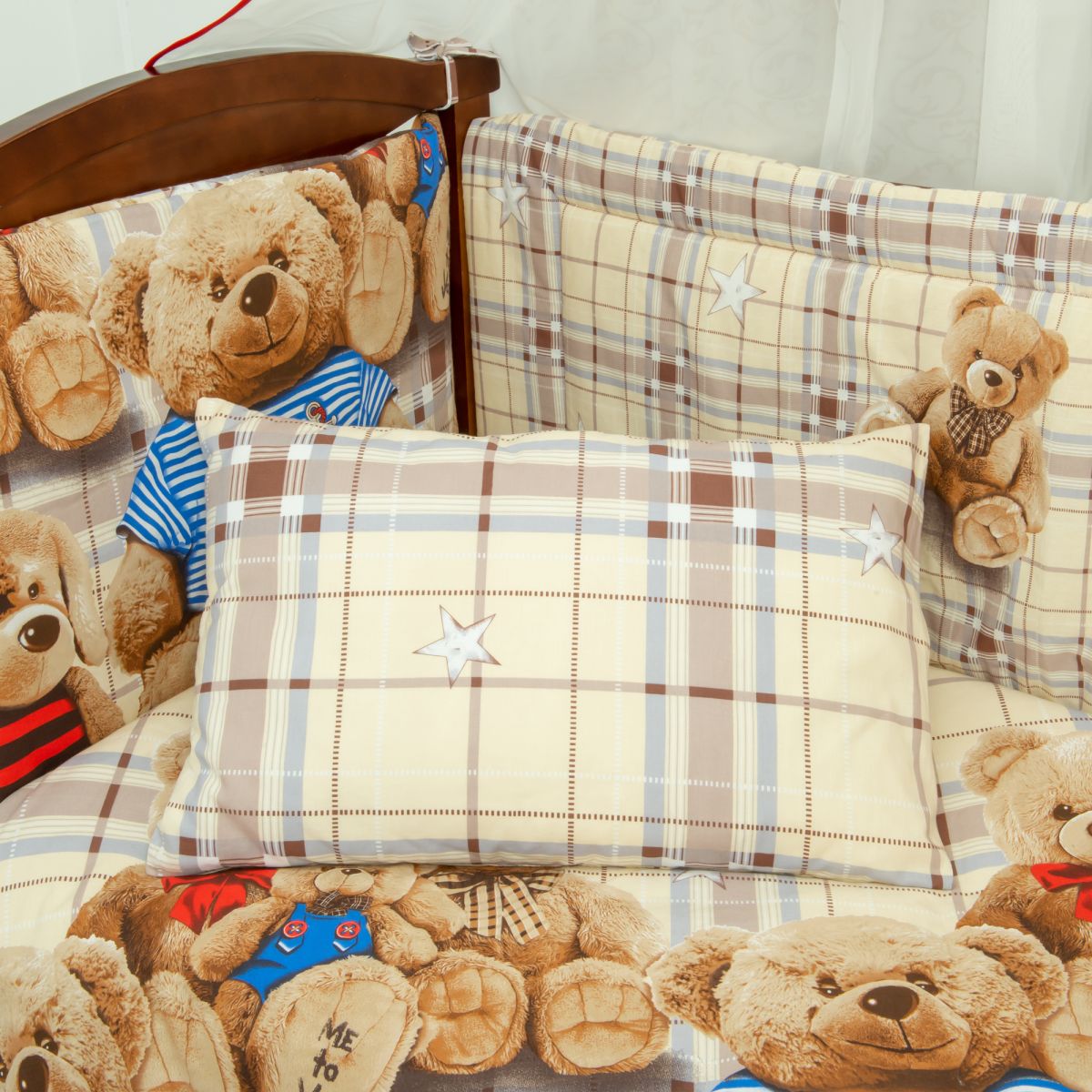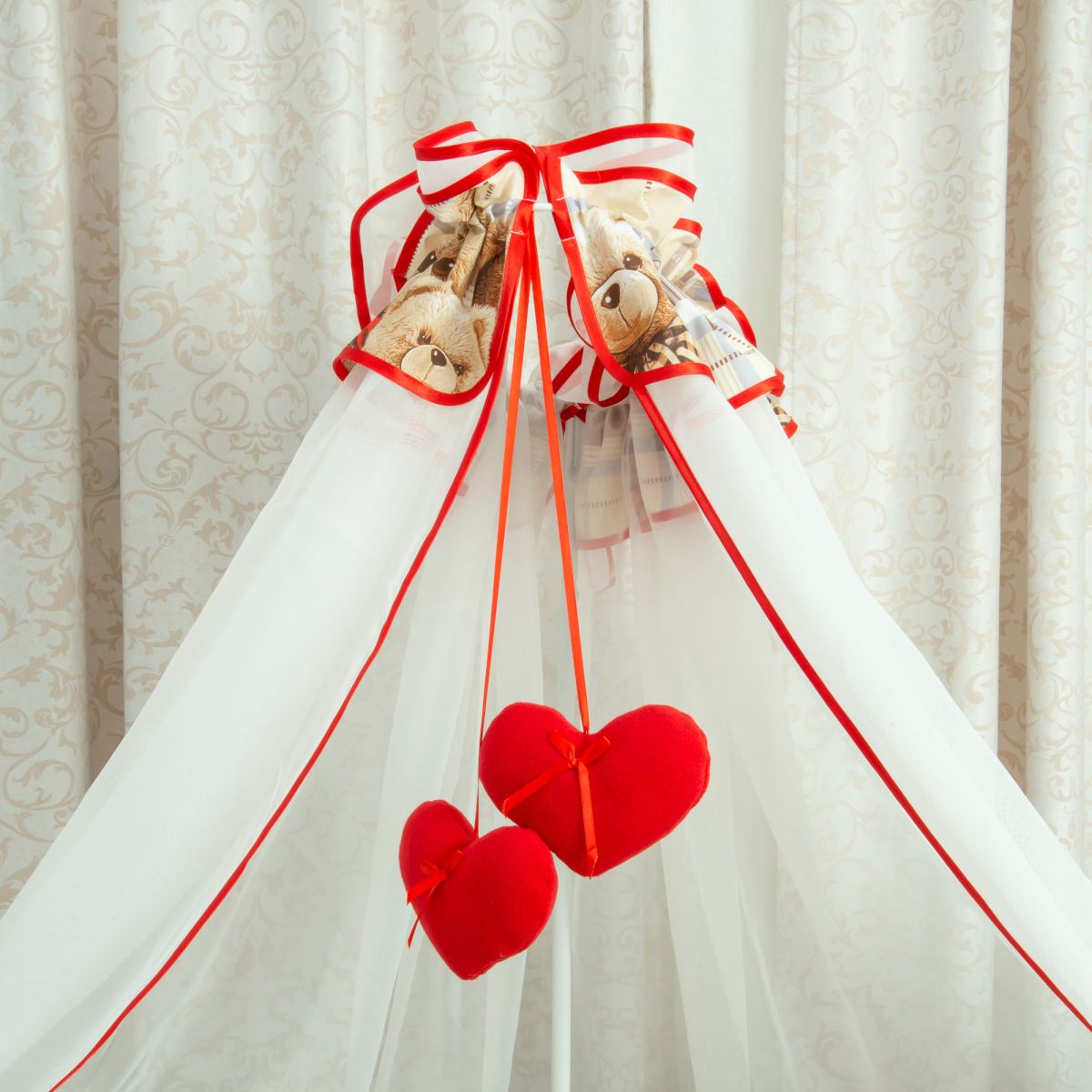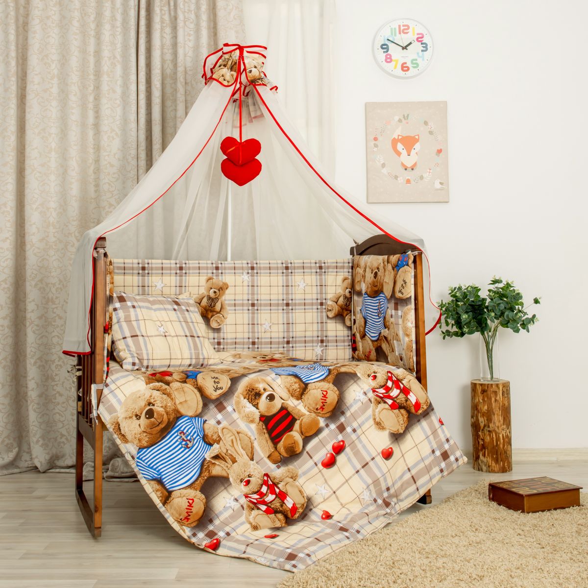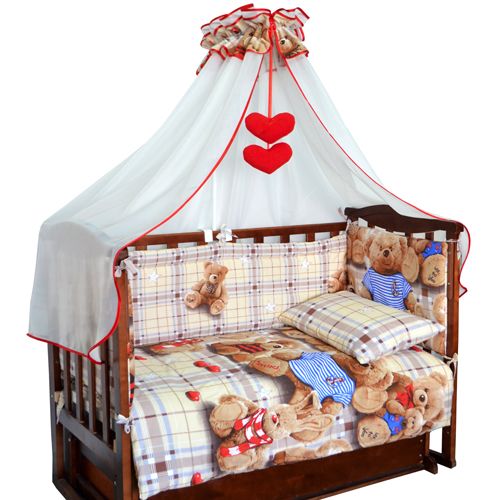 Комплект постельных принадлежностей для детской кроватки из 8-ми предметов (изготовлен из нежного сатина): - бортик высокий 50 см, на весь периметр кроватки, состоит из 4-х деталей, в качестве наполнителя используется синтепон 400 г/кв.м. - балдахин изготовлен из вуали, с отделкой из атласной бейки, размером 300*150 см; - одеяло прямоугольной формы, изготовлено из поплина, наполнитель холлофайбер 400 г/кв.м размером 110*140 см; - подушка прямоугольной формы, изготовлена из поплина, наполнитель холлофайбер 800 г/кв.м размером 40*60 см; - пододеяльник для прямоугольного одеяла, размером 112*147 см; - простыня, размером 95*147 см; - наволочка для подушки прямоугольной формы, размером 42*62 см: - мягкая подвеска-игрушка, в форме сердца. Комплект упакован в прозрачную сумку с ручками на молнии. Примечание: Держатель для балдахина не входит в комплект.