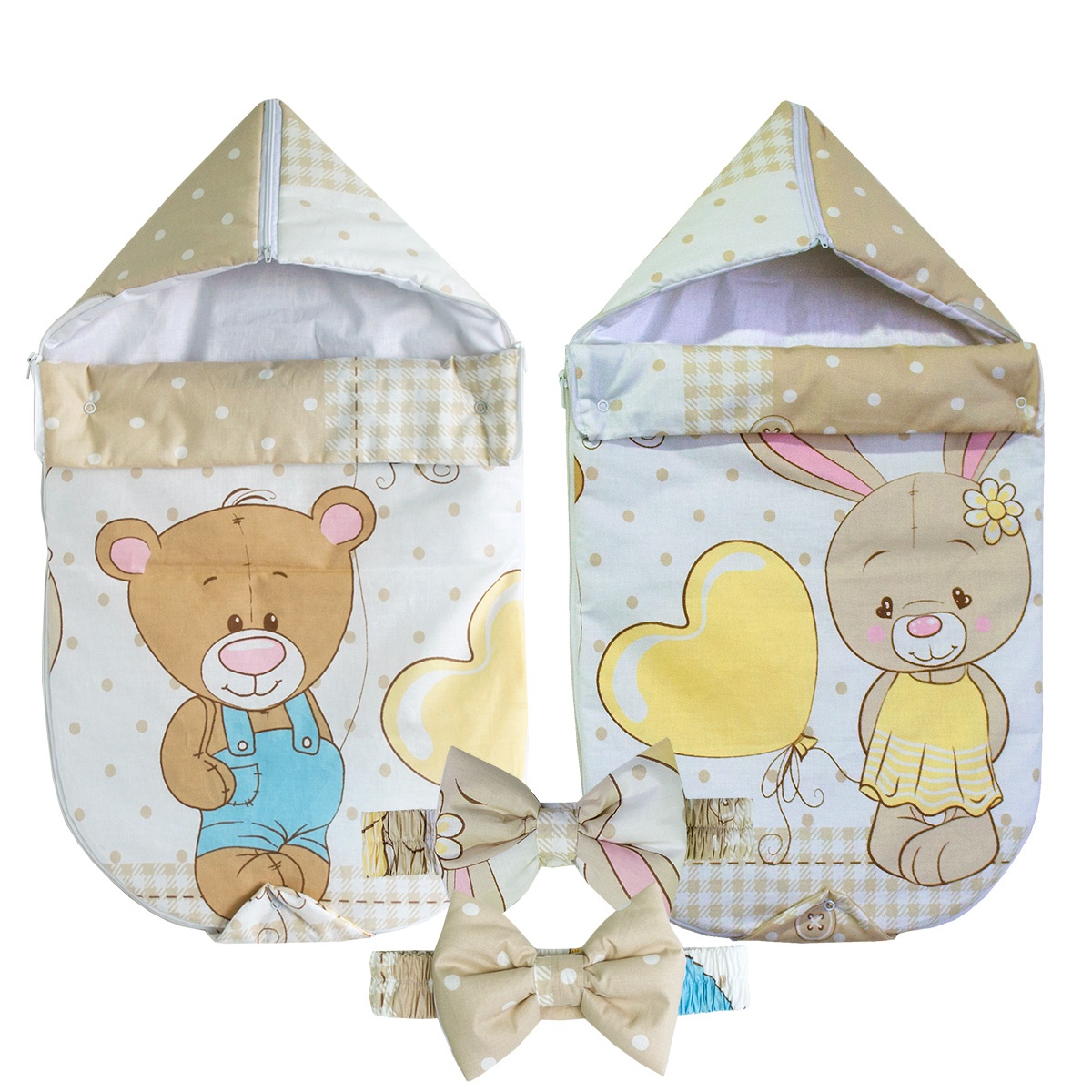 Конверт прогулочный на молниях с двух сторон, с капюшоном на молнии, с откидным клапаном на кнопках, с поясом на резине с бантом, выполнен из хлопкового тканевого материала. Цвет в ассортименте Комплект упакован в п/п пакет.