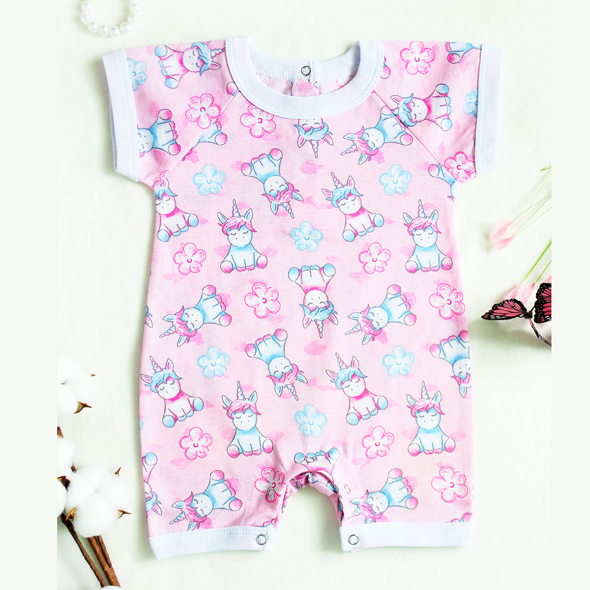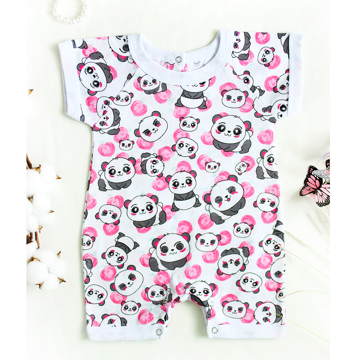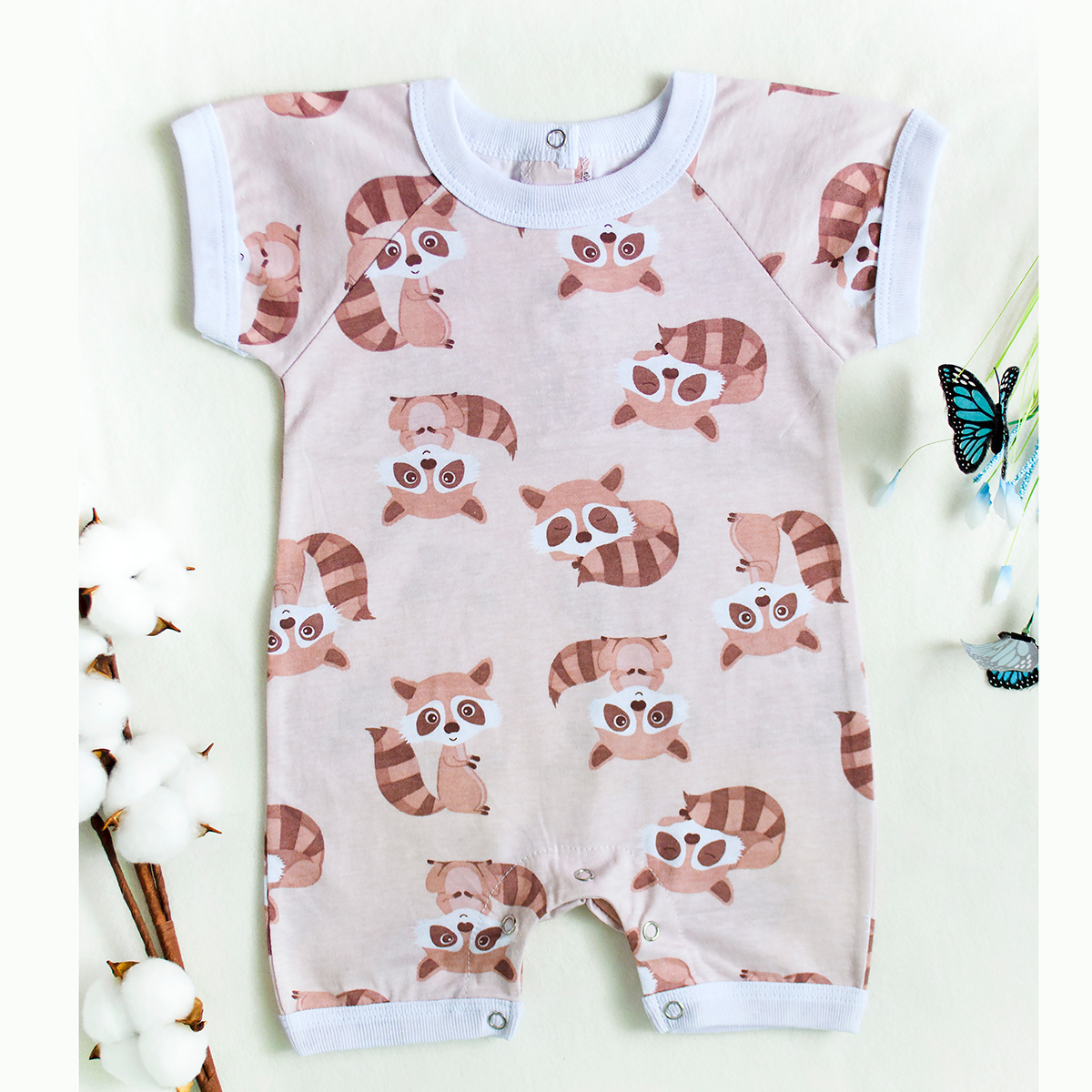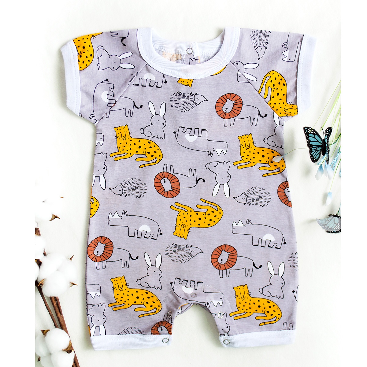 Песочник для мальчиков и девочек с коротким рукавом реглан, по спинке 2 кнопки, низ на кнопках, выполнен из легкого трикотажного полотна.