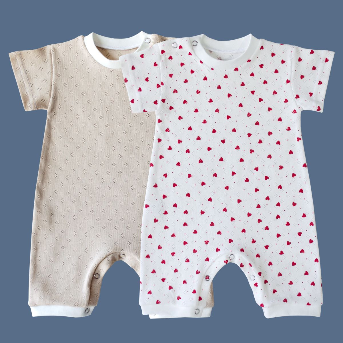 Песочник для мальчиков и девочек с коротким втачным рукавом, на плече 2 кнопки, низ на кнопках, выполнен из нежного ажурного трикотажного полотна.