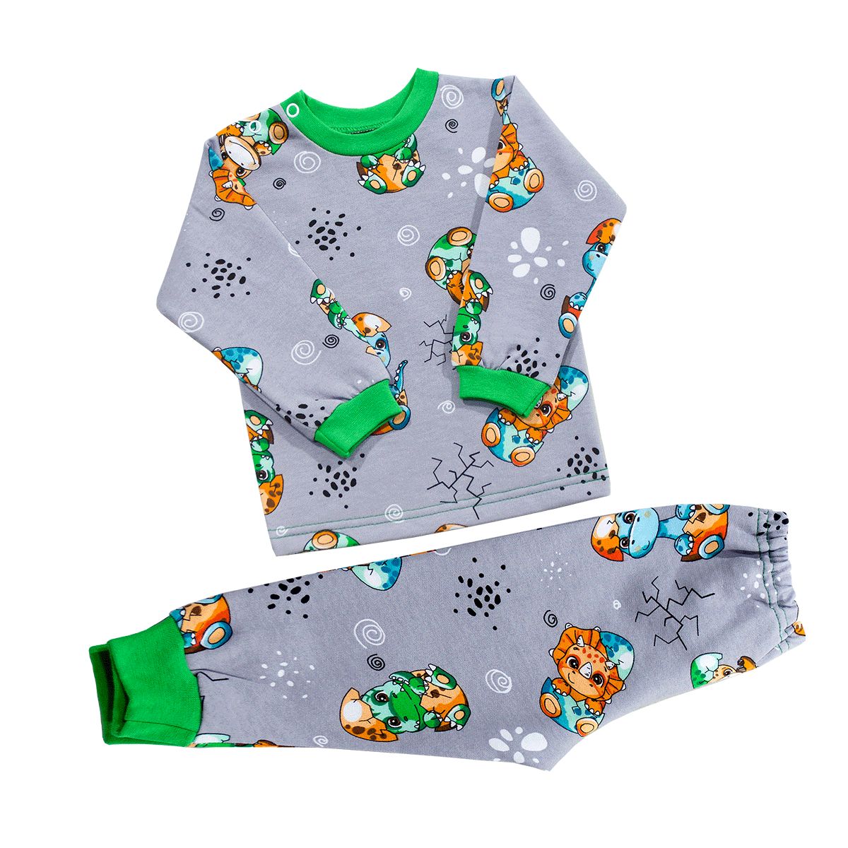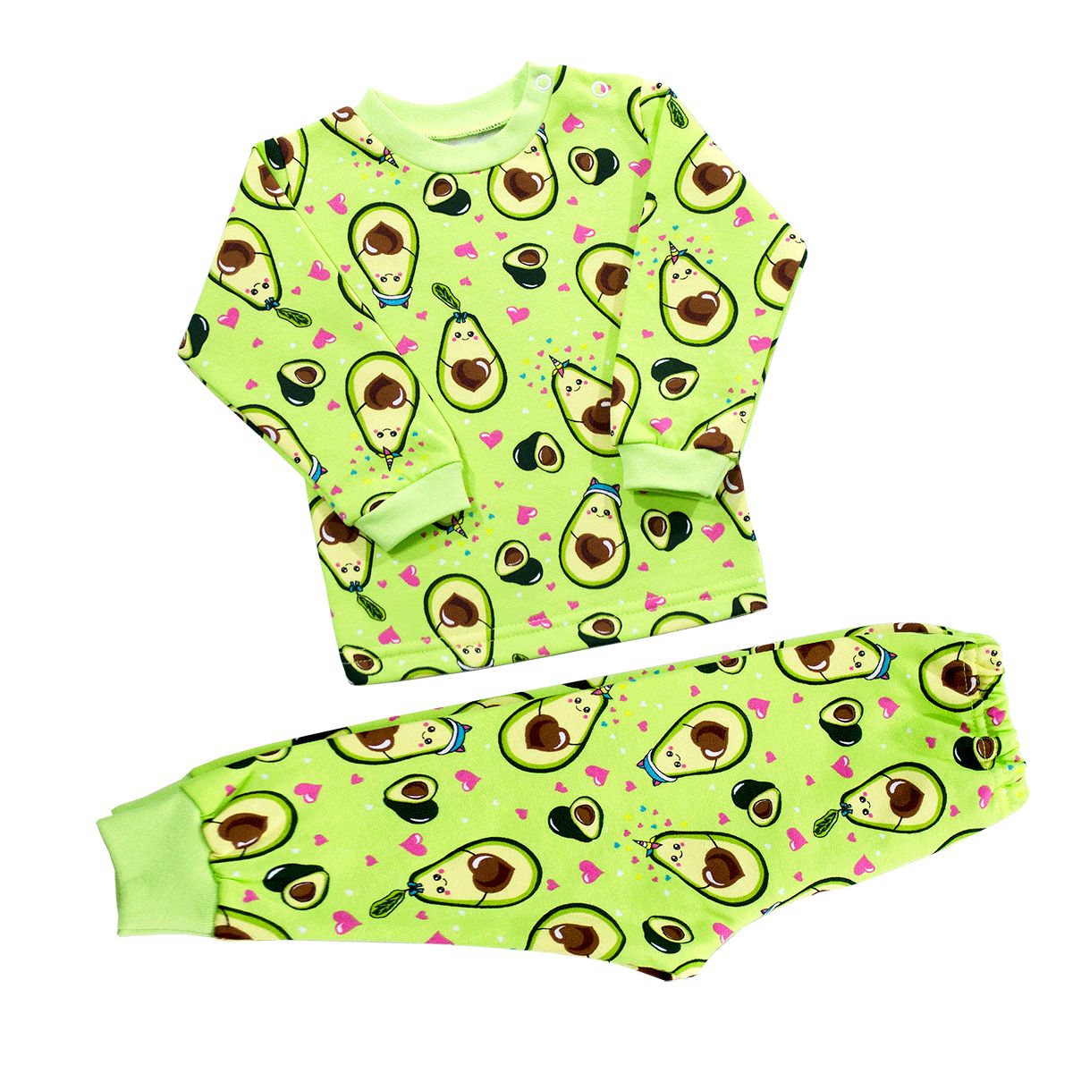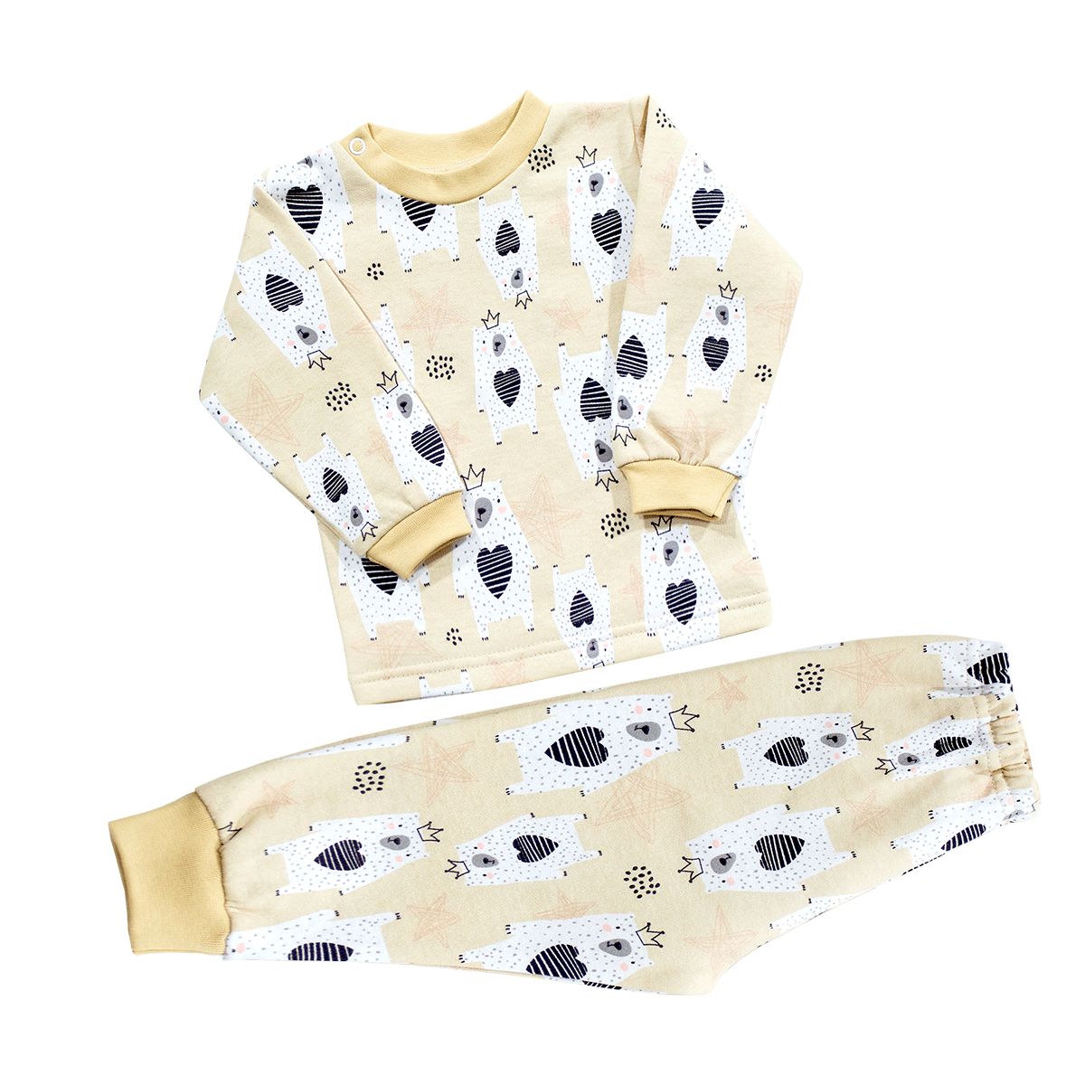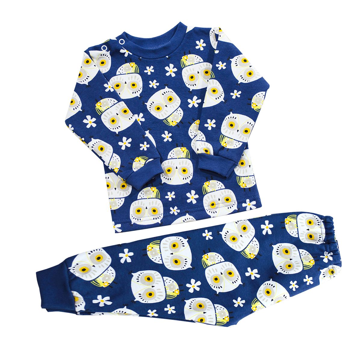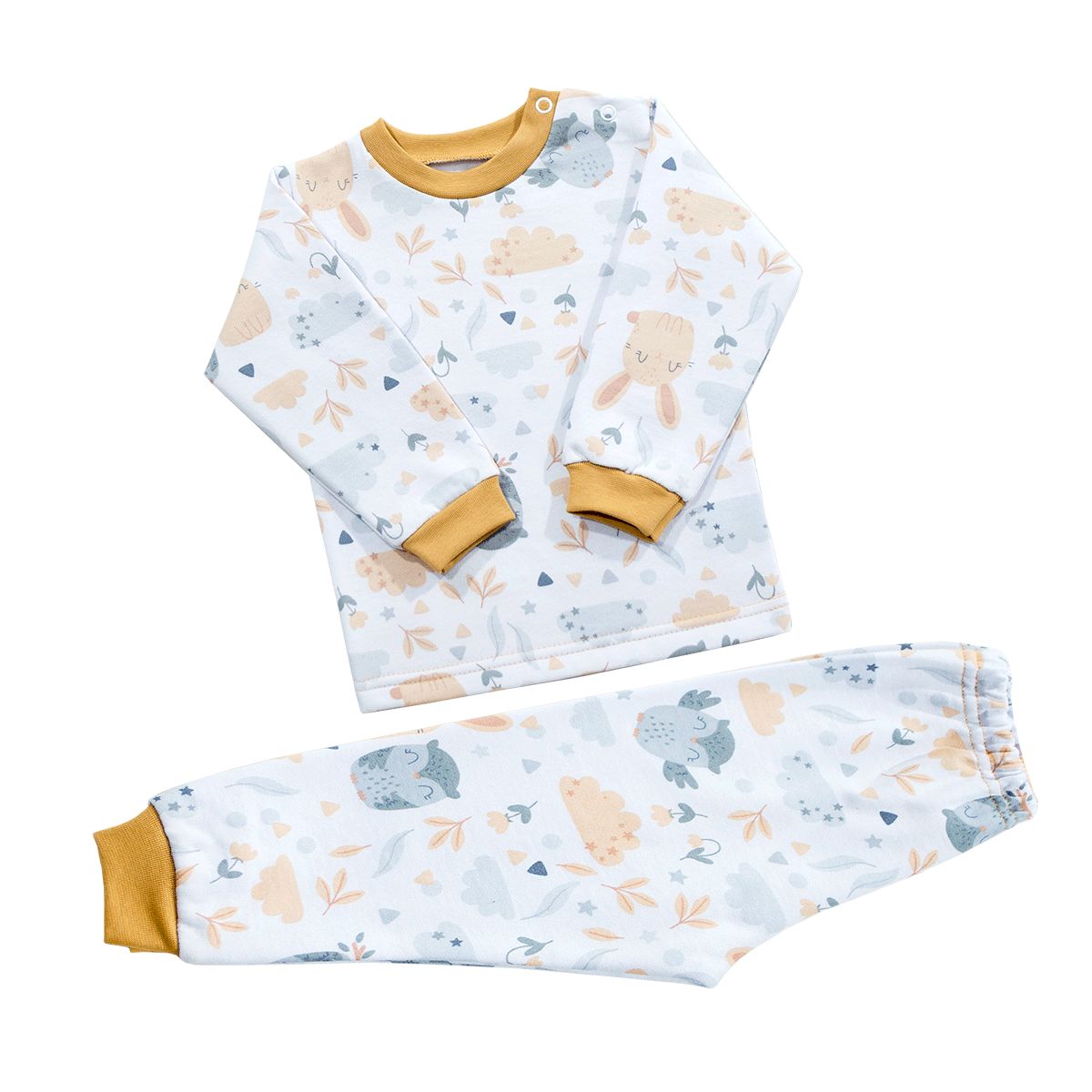 Пижама или домашний костюм, для детей от 9 месяцев до 3 лет, состоит из лонгслива с длинным рукавом на плече кнопки и штанишек на манжете, выполнена из теплого 2-х ниточного трикотажного футерного полотна. Упакована в индивидуальный пакет. Цвета в ассортименте.