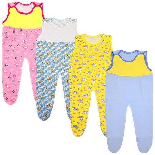 Ползунки на лямках с кнопками, с закрытой грудкой, швы наружу, следики на защипах, без ластовицы, выполнены из трикотажного полотна средней плотности. Расцветки в ассортименте. Упакованы по 1 ед. в индивидуальный пакет.