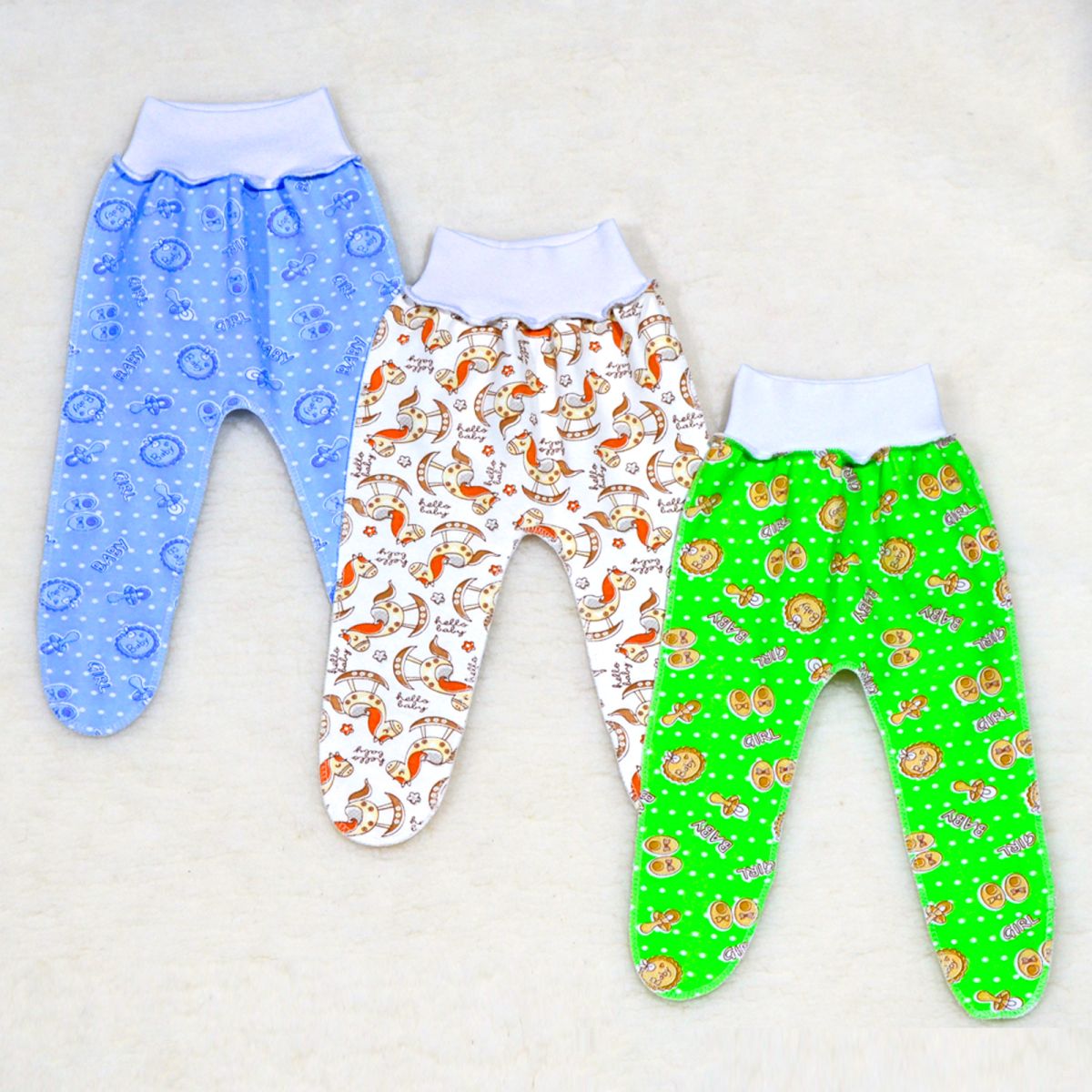 Ползунки на рибане, швы наружу, без следика, пяточка на защипе, выполнены из трикотажного полотна средней плотности. Расцветки в ассортименте. Упакованы по 1 ед. в индивидуальный пакет.