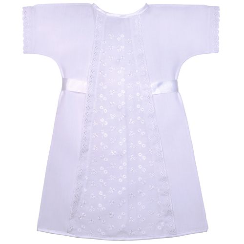 Рубашка предназначена для проведения обряда крещения, выполнена из батиста со вставкой из шитья спереди, в виде клина, дополнительно деталь переда и рукава отделаны кружевом. Модель выполнена на кнопках сзади, а атласные ленты на груди, завязываются сзади, выполняя роль пояса. Изделие упаковано по 1 ед. в индивидуальный пакет.