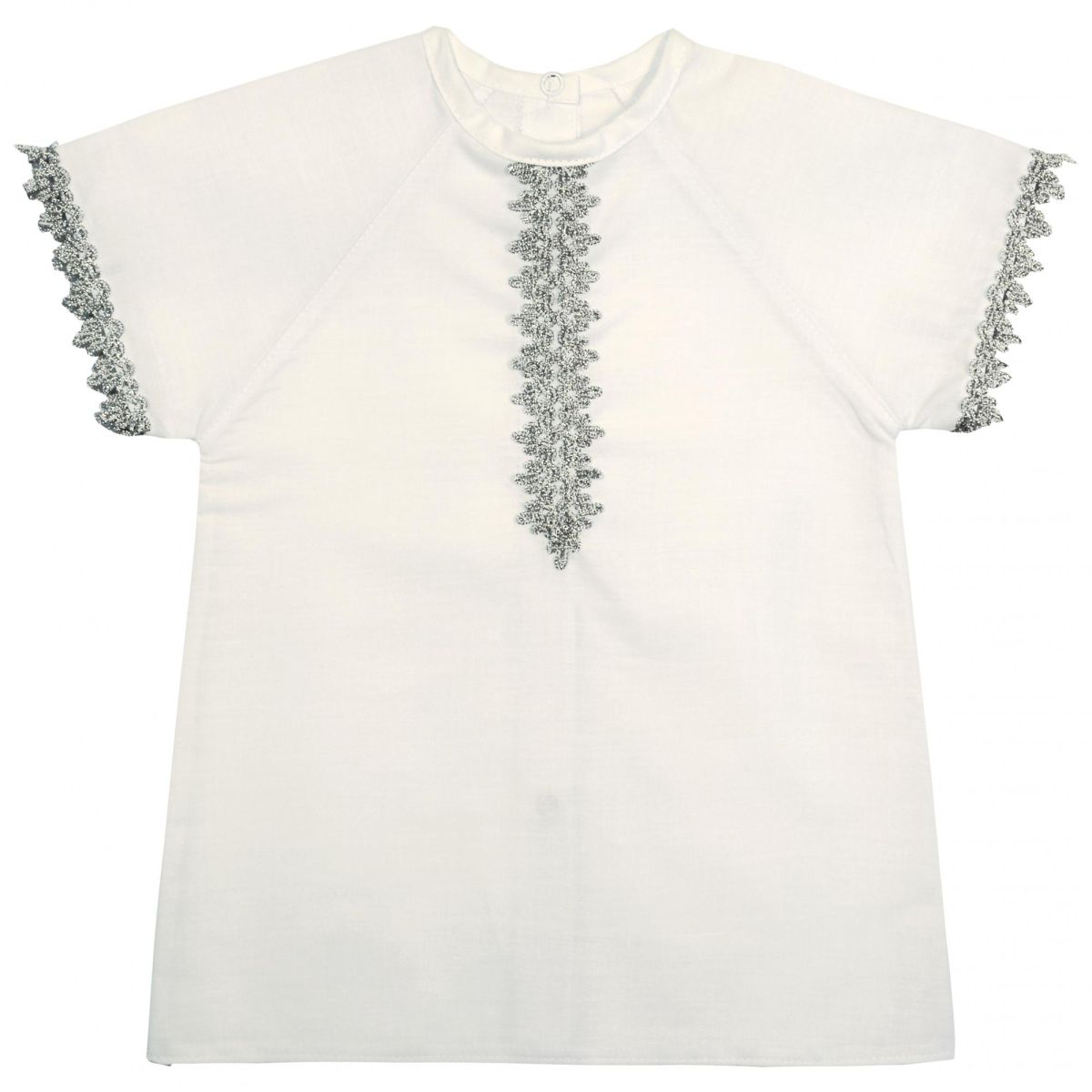 Рубашка на кнопках сзади, предназначена для проведения обряда крещения, выполнена из бязи гладкокрашеной, на грудке и по краю рукава декорирована серебристой тесьмой. Изделие упаковано по 1 ед. в индивидуальный пакет.