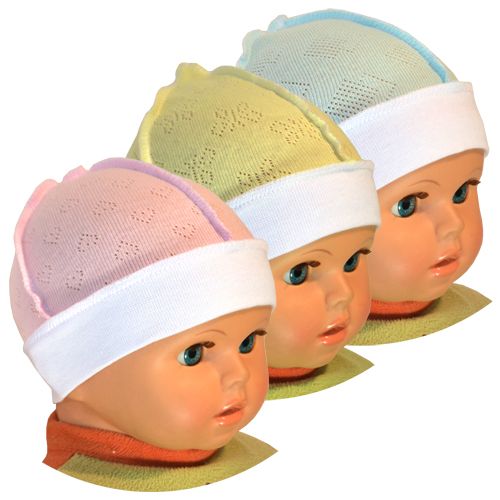 Шапочка для новорожденного на рибане из четырех клиньев, выполнена из ажурного трикотажного полотна.