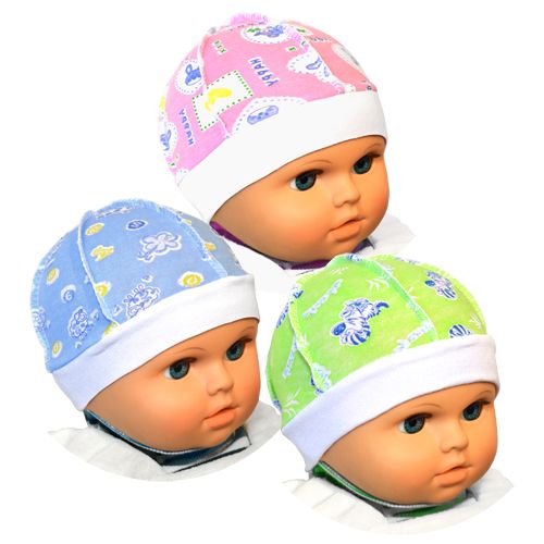 Шапочка для новорожденного на рибане из шести клиньев, выполнена из легкого трикотажного полотна.