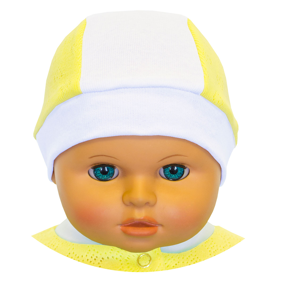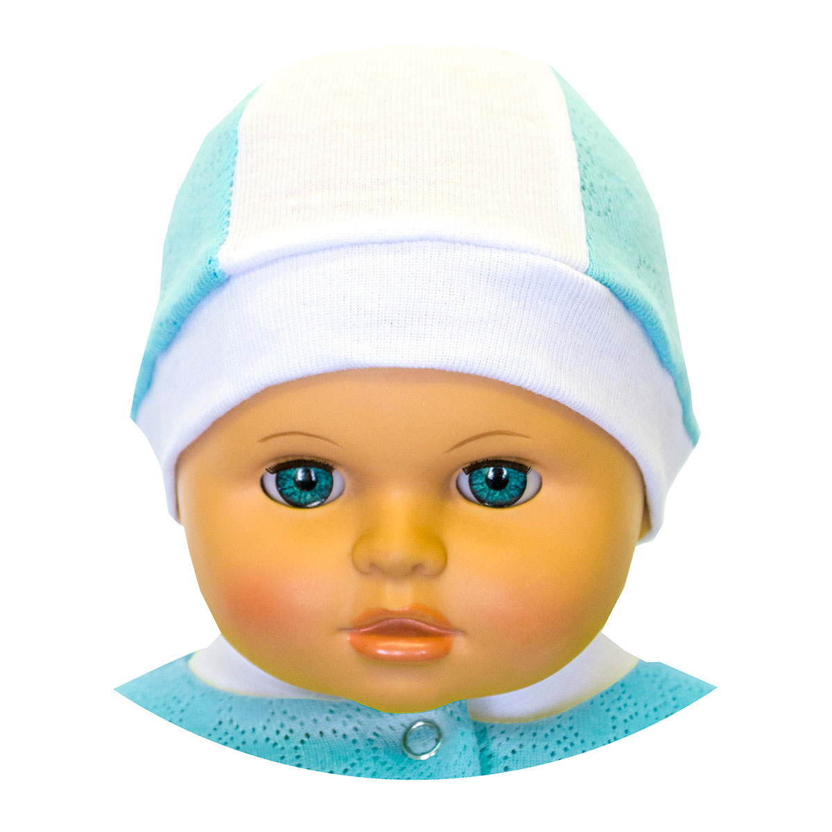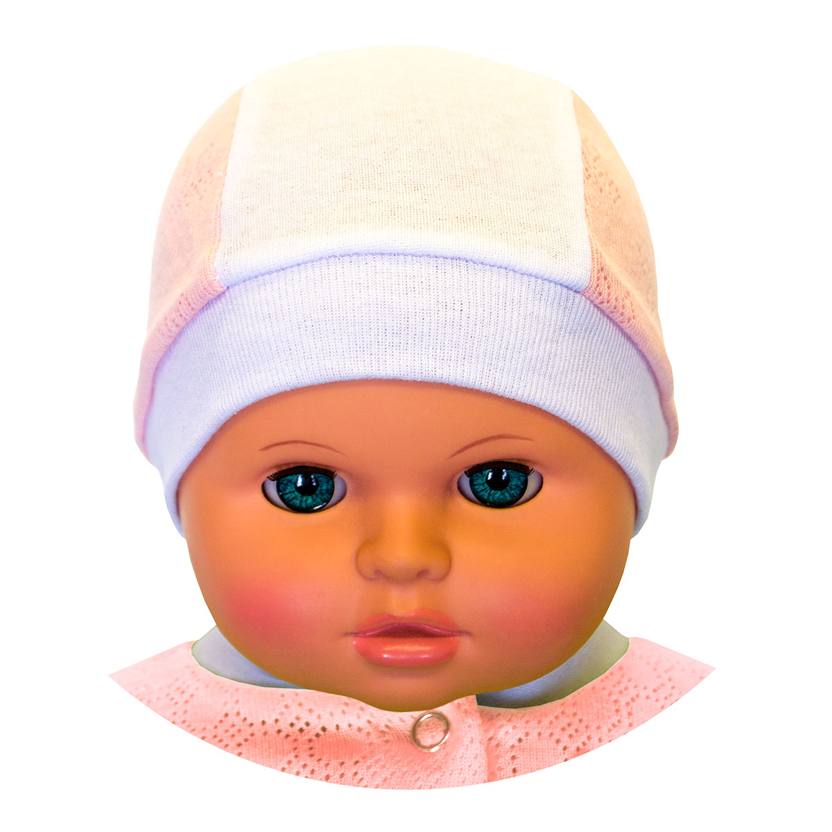 Шапочка для новорожденного на рибане с боковыми вставками, выполнена из нежного ажурного трикотажного полотна.