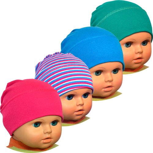 Шапочка детская с отворотом, выполнена из эластичного трикотажного полотна с лайкрой.