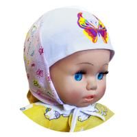 Шапочка для девочки, на завязках, выполнена из легкого трикотажного полотна с нанесением коллекционного принта. Упакована в индивидуальный пакет. Цвет как на фото.