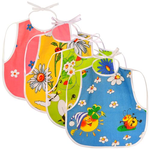 Слюнявчик фартук, верх выполнен из бязи, низ непромокаемый из клеенки. Цвет в ассортименте. Упаковано по 1 ед. в индивидуальный пакет.
